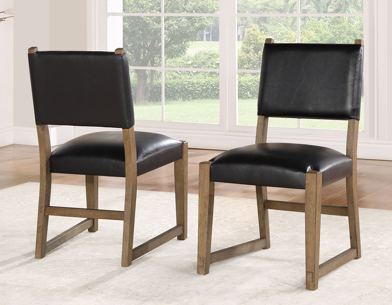 Rustic styling and soft seating in a chair comfortable in a dining, guest or office setting. The Atmore Side Chair features a beautiful easy-care black leatherette seat and back accented with a hand-stained deep driftwood finished solid wood frame. A semi-sled base and wood score distressing add elements of industrial design and primitive chic to fit casually sophisticated interiors.