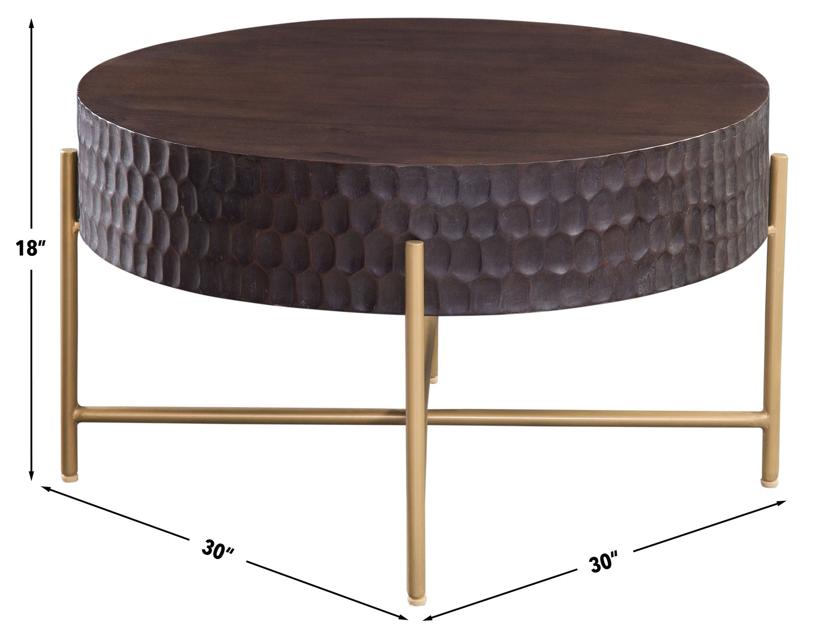 The Bobbi Coffee Table combines artisanal texture with modern sophistication. Crafted from solid mango wood, its hand-sculpted honeycomb sides highlight the natural grain, finished in a rich burnished espresso. A matte brass iron base adds bold contrast and features a cross-stretchered design for stability. The powder-coated metal resists wear, while kiln-dried wood minimizes cracking or warping over time. With its refined craftsmanship and distinctive materials, the Bobbi Coffee Table makes a striking statement in modern, industrial, or transitional living spaces.