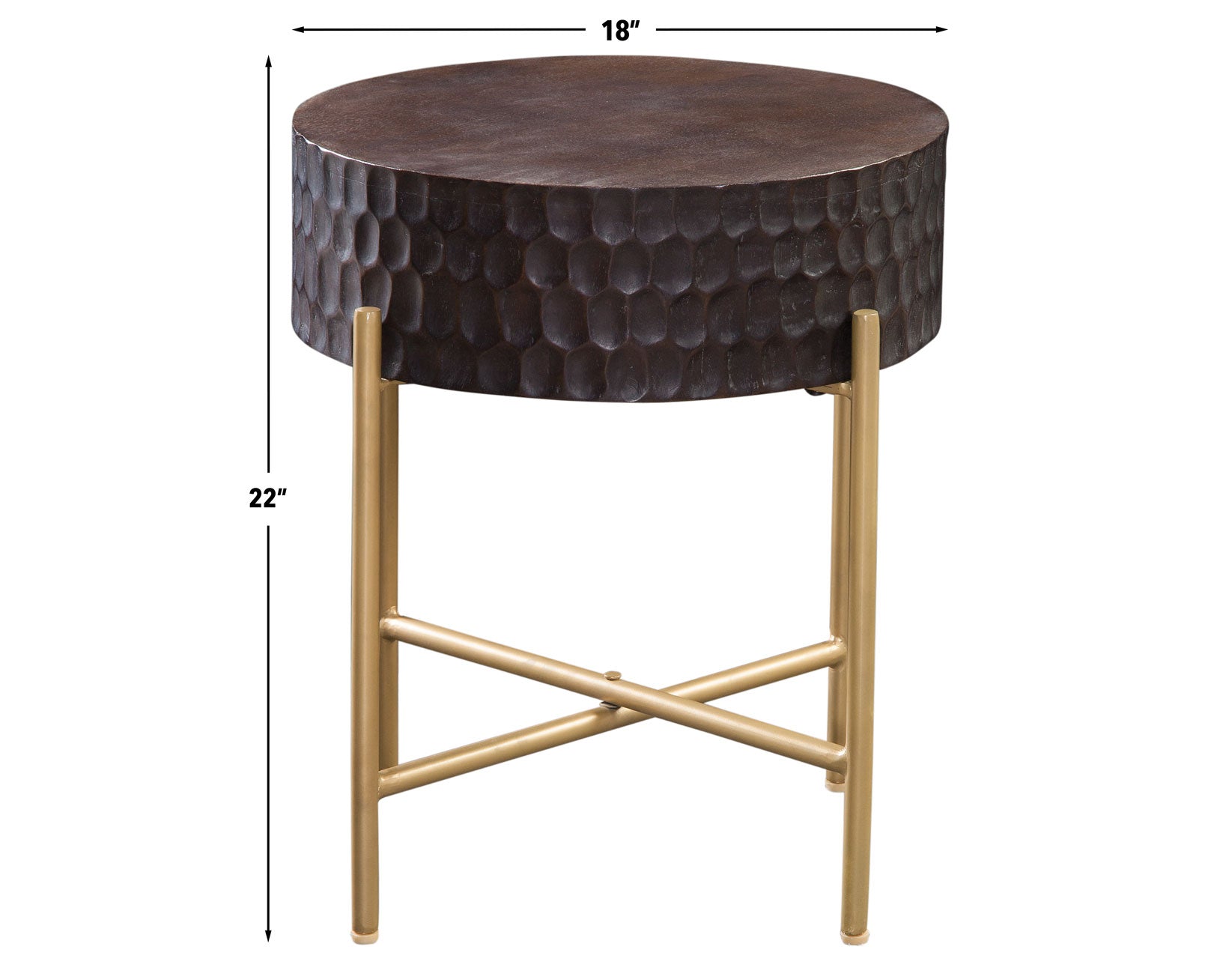 The Bobbi Solid Wood End Table blends artisanal texture with modern elegance in a compact, functional form. Crafted from solid mango wood, its hand-sculpted honeycomb sides reveal the wood’s natural grain, enhanced by a burnished espresso finish. A matte brass iron base adds striking contrast and features a cross-stretchered design for lasting support. Perfect as a standalone accent or paired with the Bobbi Coffee Table, this versatile piece complements modern, industrial, or transitional interiors with refined craftsmanship and bold mixed-media design.