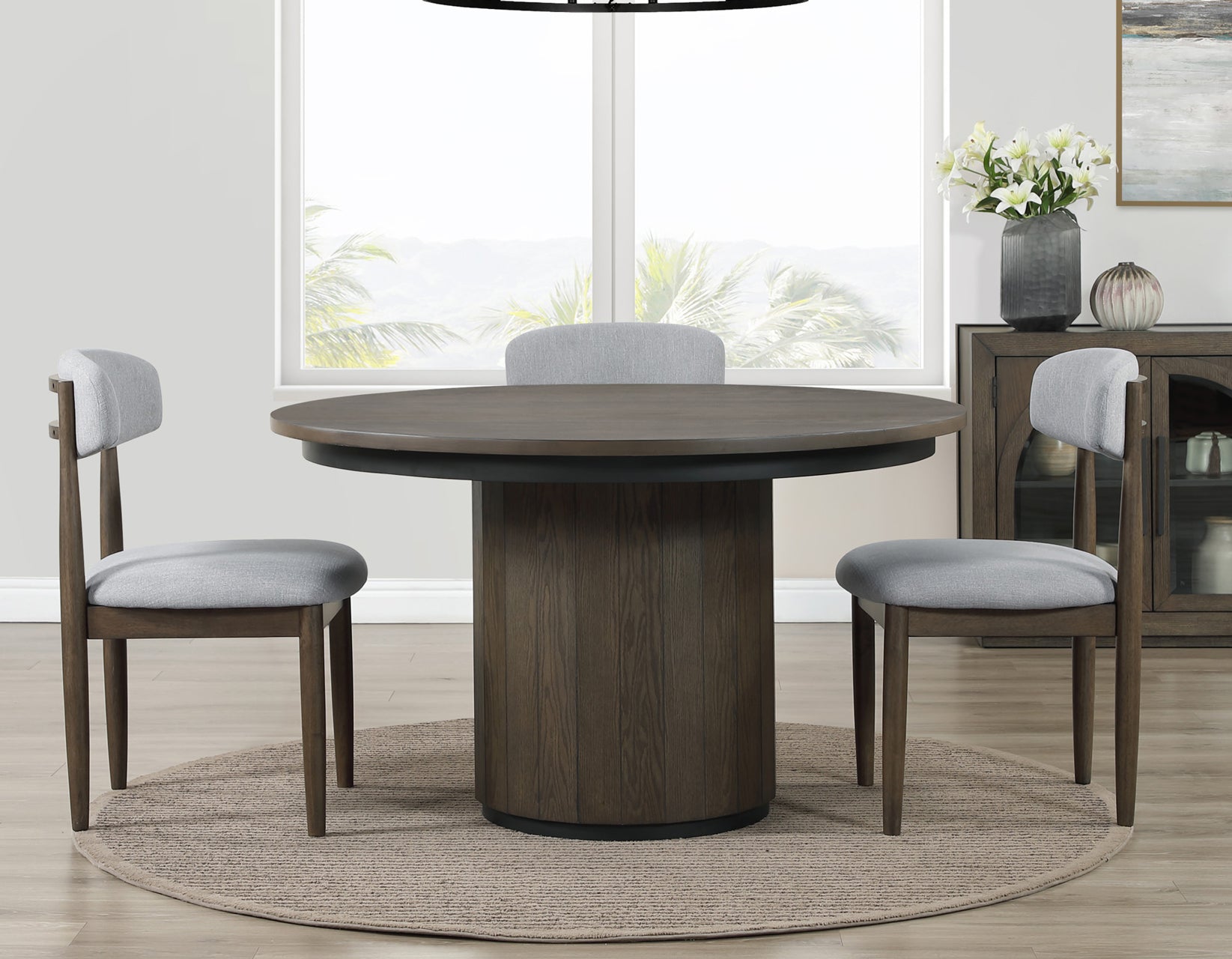 The Burlington 52-inch Round Table in mocha forms a centerpiece that marries elegance with style. The table features a sturdy circular base, providing a strong foundation while offering ample clearance for chairs. Its unique polygonal circle design is highlighted by a striking black accent on the apron and base that seamlessly elevates the ebony finish to create a cohesive and luxurious look. Designed to comfortably seat up to six people, the Burlington Table is ideal for fostering a cozy and intimate atmosphere, perfect for close-knit gatherings and engaging conversations.