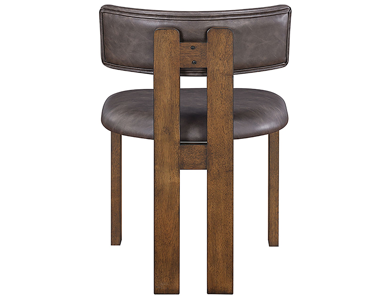 The Cambridge Side Chair blends clean, modern lines with warm, rustic appeal. Crafted from solid Asian hardwoods with a burnished chestnut finish, the chair features a comfortably padded seat and curved backrest upholstered in rich, dark brown vegan leather. The supple faux leather offers the look and feel of genuine hide with added durability and easy care. Its minimalist silhouette and earthy tones make it a versatile choice for dining rooms, game tables, or casual seating areas—perfectly complementing both contemporary and transitional décor.