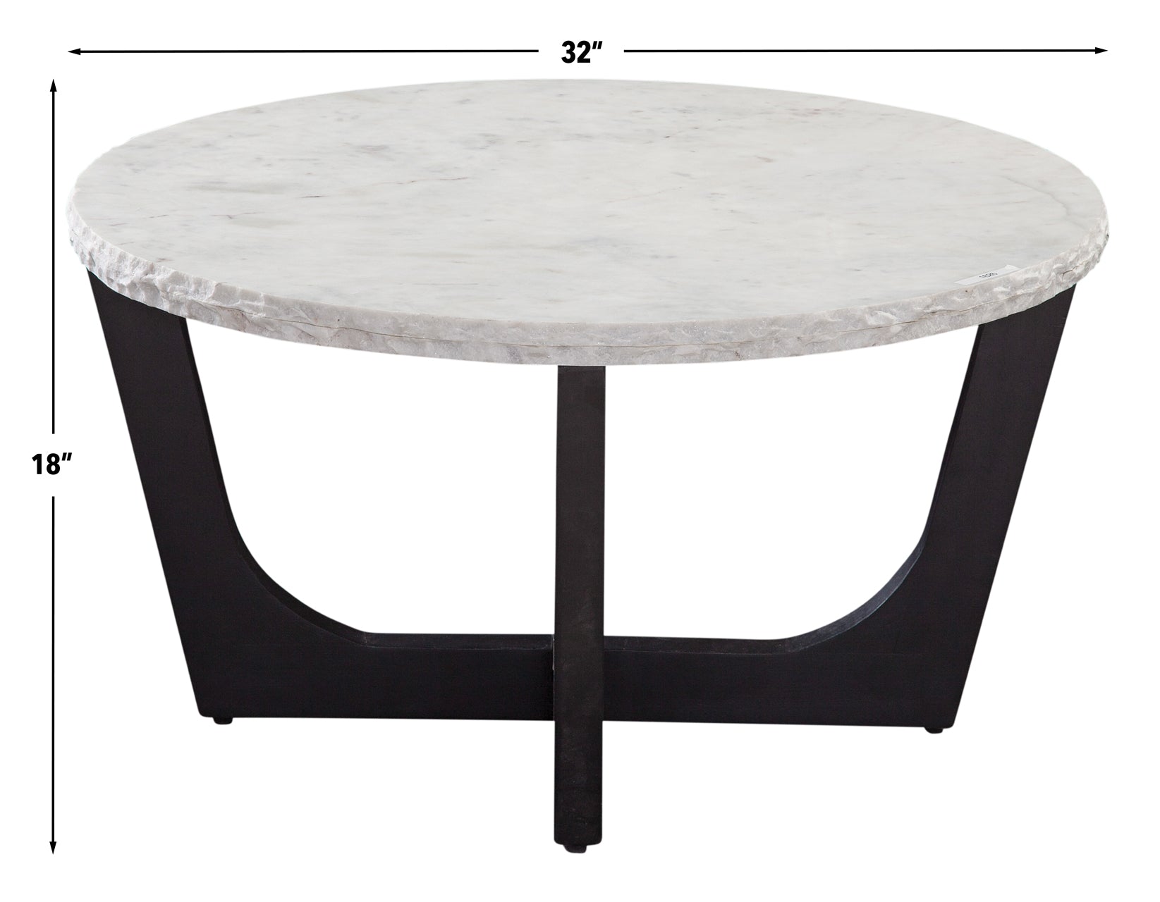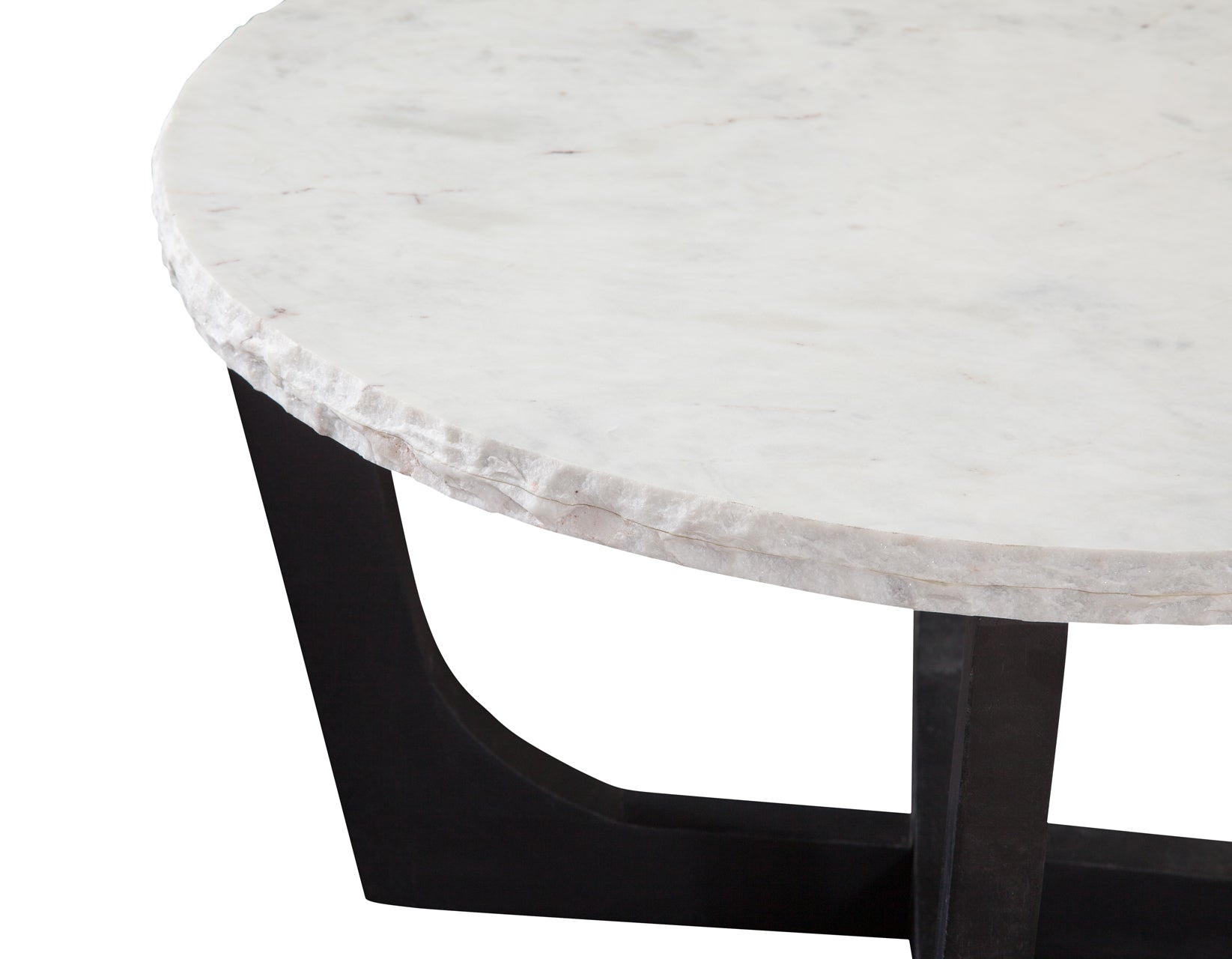 The Chrissy Table Set blends flowing round lines with the timeless beauty of marble, creating an elegant focal point for any living room. Its transitional design features a tapered solid wood double trestle base in an ebony finish, offering bold contrast to the organic live edge marble top. This unique combination pairs a polished surface with a rugged, natural edge, adding a refined yet rustic touch.