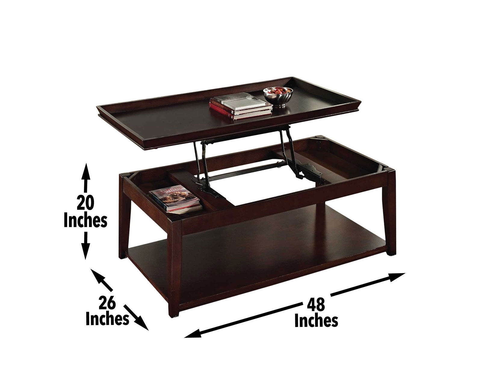 The Clemson collection balances style and versatility. The lift top cocktail table is constructed of hardwood solids and crisscross birch veneer lay-up in a merlot cherry finish. Features include hidden storage, casters for mobility and a bottom display shelf.
