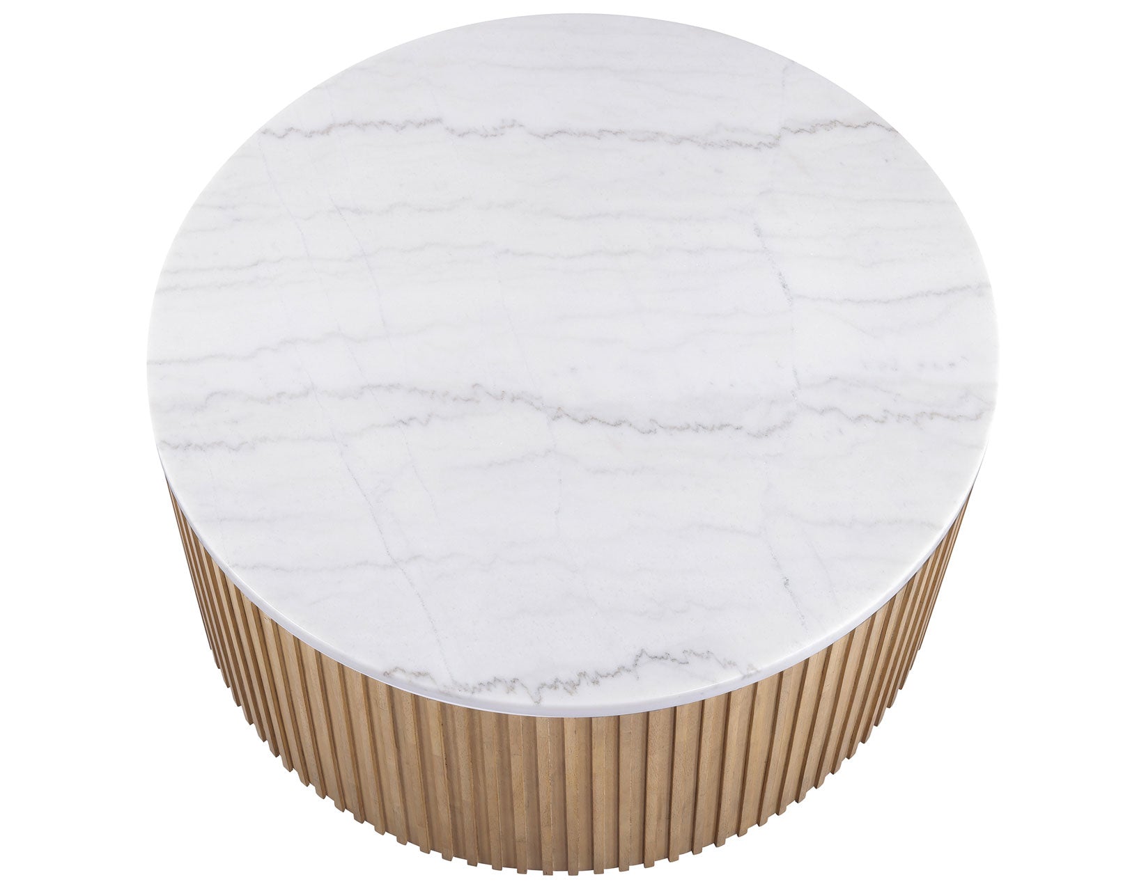 The Colvin 3-Piece White Marble Top Table Set, Toffee Finish brings timeless elegance with its Art Deco and Empire-inspired styling. The 36″ Round White Marble Top Coffee Table features a lustrous marble surface and toffee-finished reeded base, combining sleek design with practicality. Equipped with casters for easy mobility, it’s perfect for repositioning or cleaning. Completing the set are two matching White Marble Top End Tables, ideal as side companions to chairs or sofas. This set blends luxury, versatility, and sophistication, effortlessly elevating your living space in minutes.