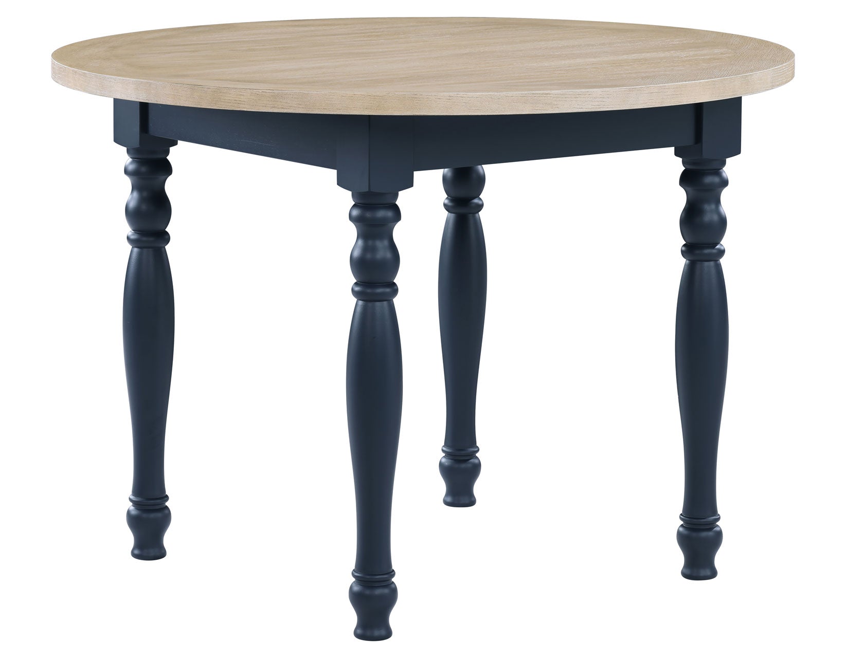 Bring charm and functionality to your dining space with the Darcy 5-Piece Dining Set, a seamless blend of style and comfort. The 42″ round table features a natural wood top and intricately turned midnight blue legs, combining farmhouse charm with modern elegance. Paired with four chairs showcasing a modified X-back design, two-tone finish, and contoured seats, this set creates a cozy and inviting setting for meals or gatherings. Perfect for dining rooms or breakfast nooks, the Darcy delivers a rustic-modern aesthetic that’s both durable and stylish.
