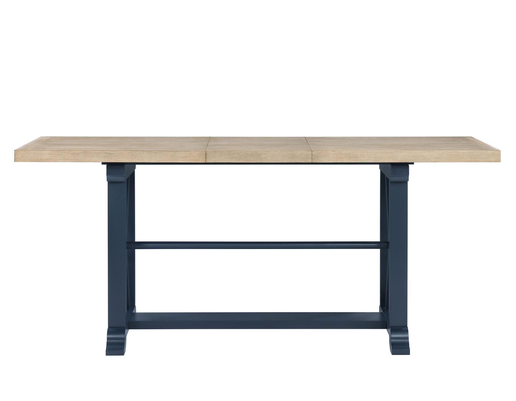 Bring charm and functionality to your dining space with the Darcy 5-Piece Counter Set. The extendable table features a natural wood top and squared midnight blue legs, blending farmhouse charm with modern elegance. With its 18-inch leaf, the table expands from 64 to 82 inches, comfortably seating up to six guests. The four counter-height chairs showcase a modified X-back design, two-tone finish, and contoured seats for added comfort. Ideal for dining rooms or breakfast nooks, the Darcy combines durability with inviting rustic-modern style.
