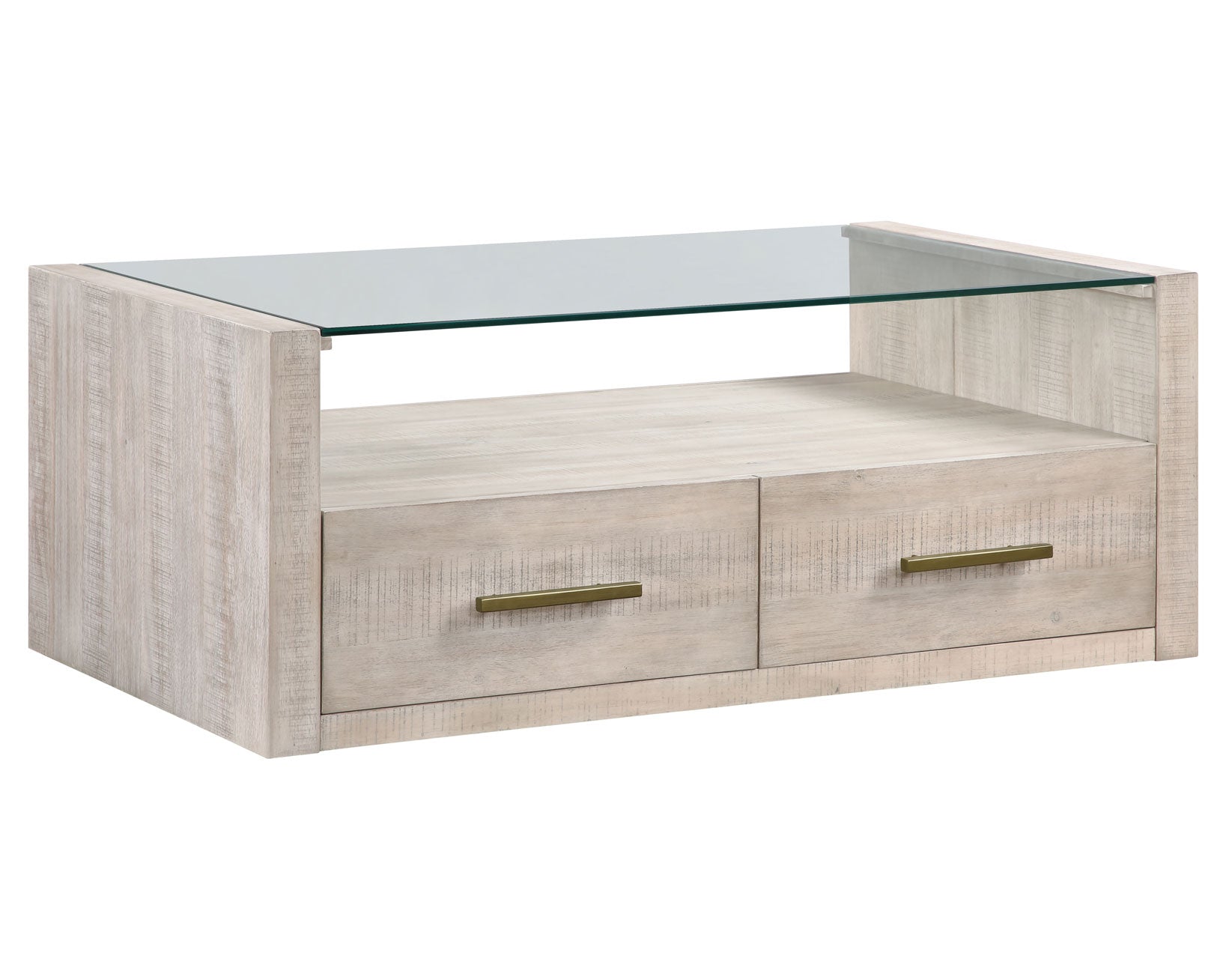 Bring casual elegance to your living room with the Garland 3-Piece Table Set. At the center is the Garland Castered Coffee Table, a stylish blend of modern design and rustic charm. Its clean lines and saw rasp distressing in a modern washed parchment finish create a stunning focal point. The clear glass top offers a lovely display area, while two drawers provide essential storage. Hidden casters make it easy to move, while the matching Garland End Tables complete the set with chic glass tops for versatile side placement.