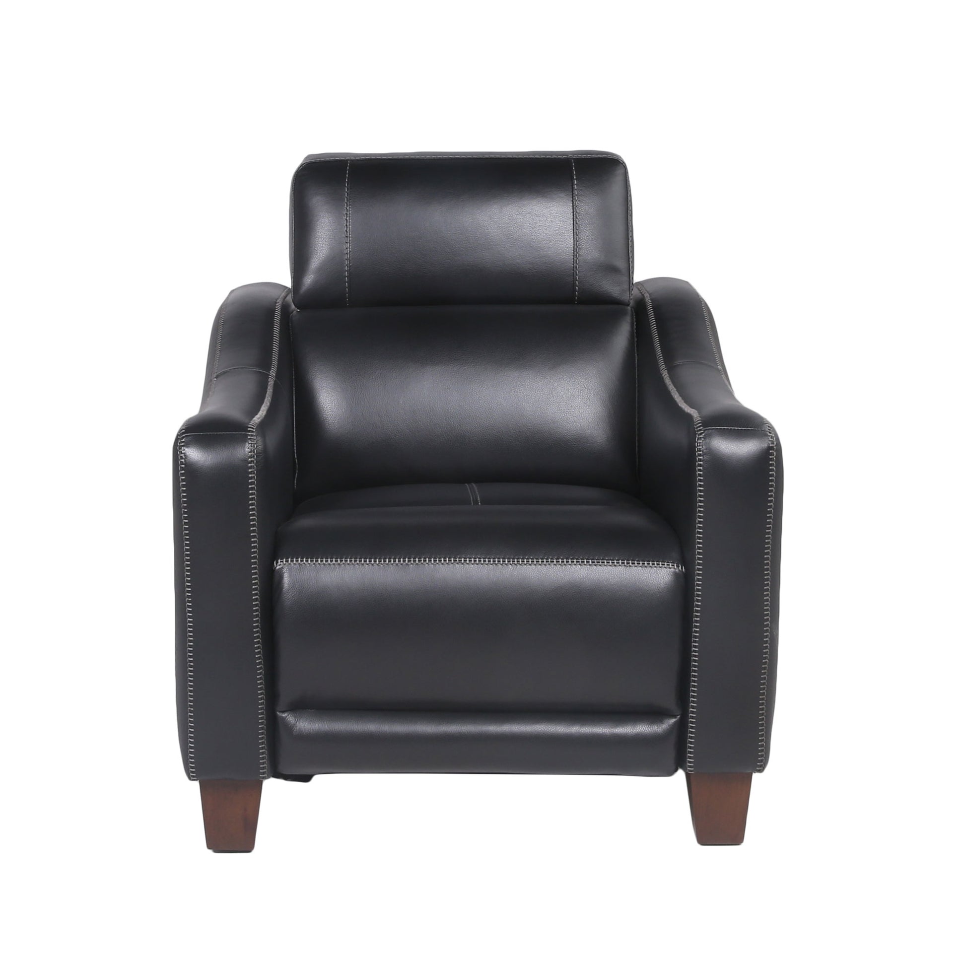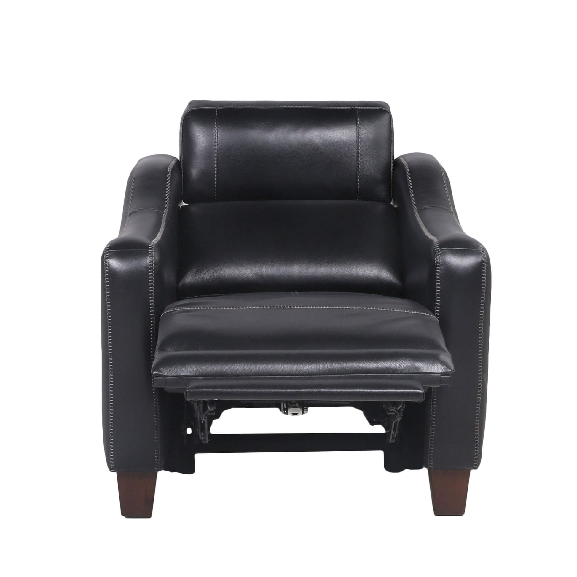 Transitional design in a dual-power leather recliner. This chair will quickly become everyone’s favorite with its top grain leather, stylish high-leg design and wall-saver reclining mechanism that ensures you won’t bang up any walls. The midnight color matches virtually any decor scheme while ensuring comfort every time.