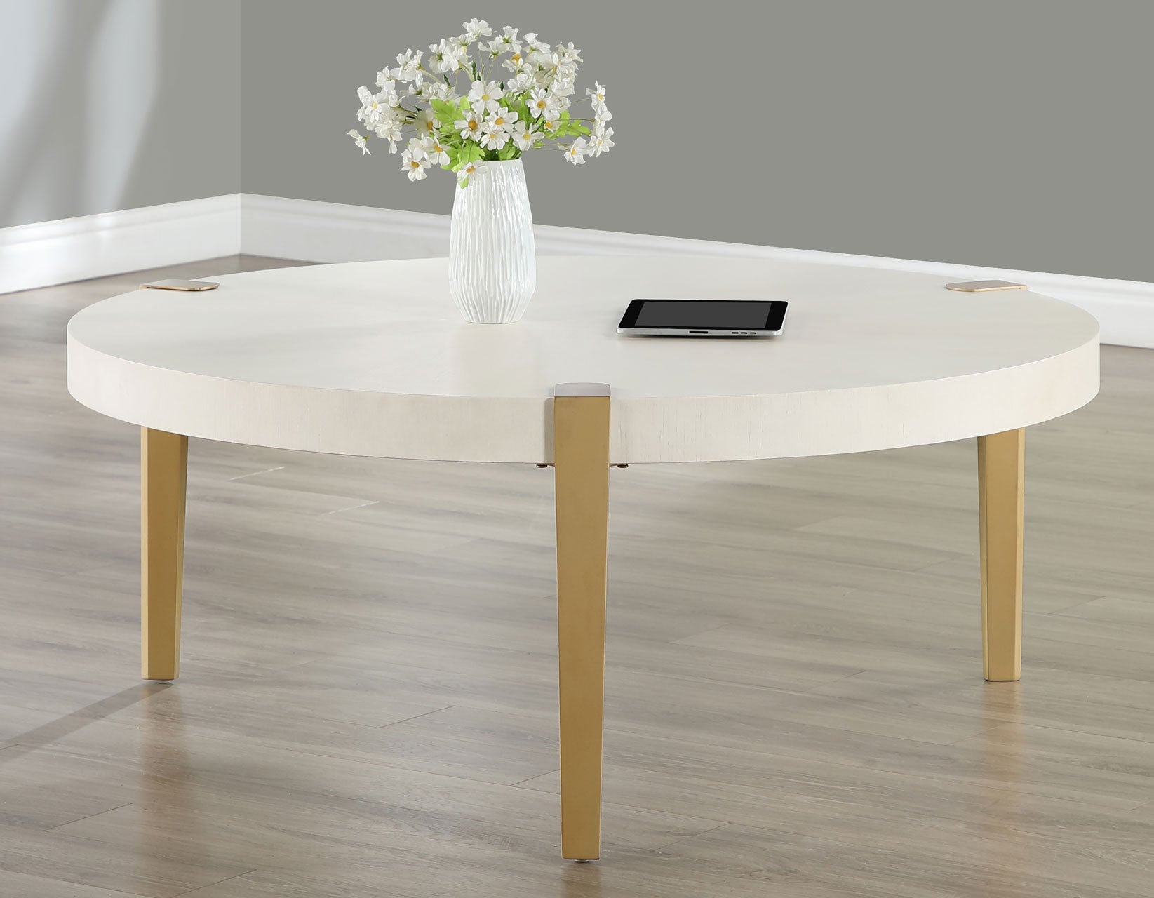 The Gracie 3-Piece Table Set, featuring a 48-inch round cocktail table and two end tables, blends modern industrial charm with elegant design. The cocktail table stands proudly on three satin gold-finished metal legs, adding a bold, contemporary look. Its round silhouette with a washed white finish showcases oak veneers in a mesmerizing sunburst layup. The matching end tables complement the cocktail table’s light and airy aesthetic. Enhancing any space with their impressive design, this set combines style and functionality, transforming your living area into a sophisticated haven.