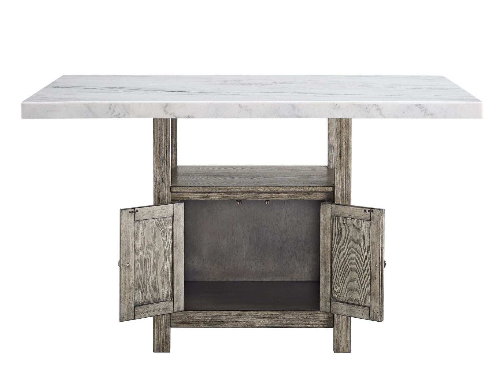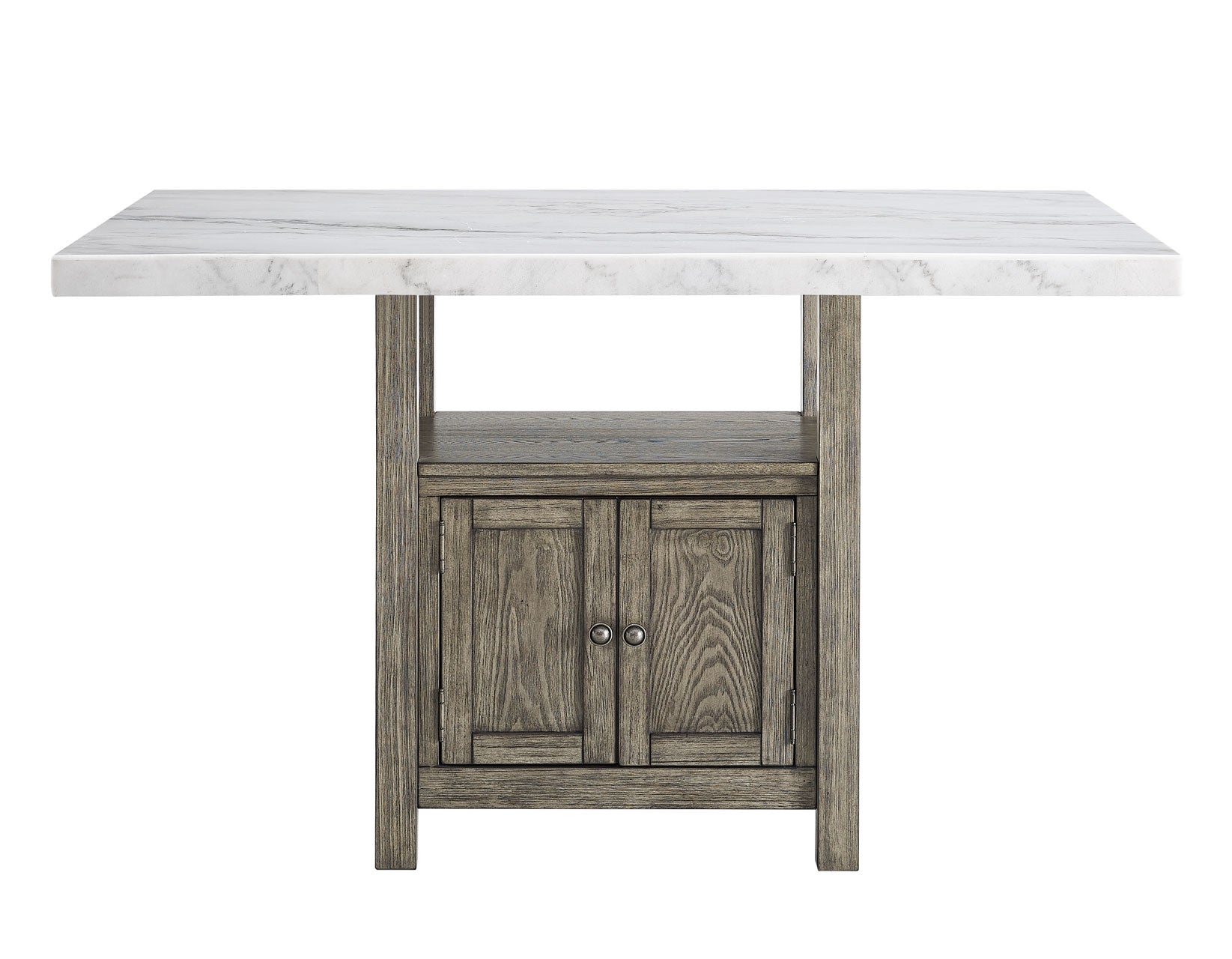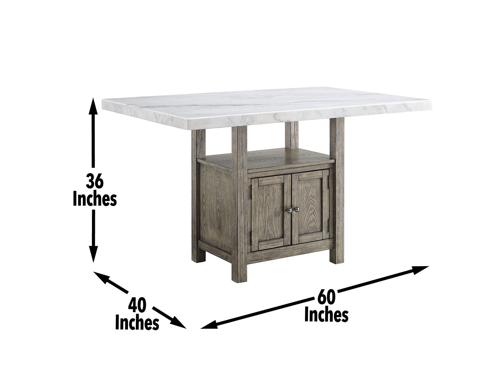Refined rustic styling brings an elegant casual feel to dining in the Grayson Counter Dining Table. A beautiful white marble top pairs beautifully with a Driftwood finish in a style that is good for both everyday and special event dining. The Counter Table offers valuable storage in the base for placemats, silverware or other items. The 60 inch table accommodates six comfortably using the available Counter Chairs and/or Counter Bench.