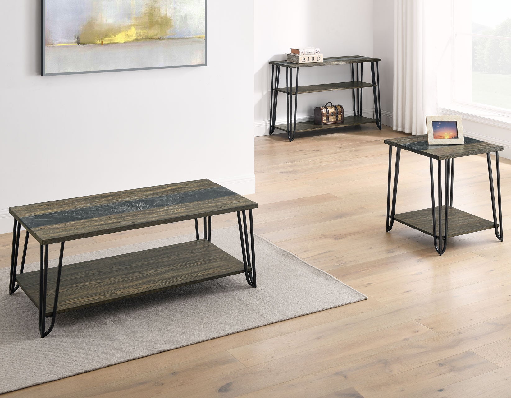 The Harper 3-Piece Set, featuring a cocktail table and two end tables, is a harmonious fusion of casual rustic allure and mid-century modern sophistication. The cocktail table, at 45 inches in length, boasts a distressed dark driftwood finish and eye-catching sintered stone inlay, making it a standout mixed-media focal point. Complementing it are the two end tables, each echoing the cocktail table’s design with their canted iron legs and distressed finish. These pieces collectively bring a retro-modern charm to any living space. The end tables serve as perfect accents beside a sofa or bed, with their functional bottom shelves offering additional storage or display space. This set is the epitome of stylish functionality, ideal for a casually elegant and modern living room setting.