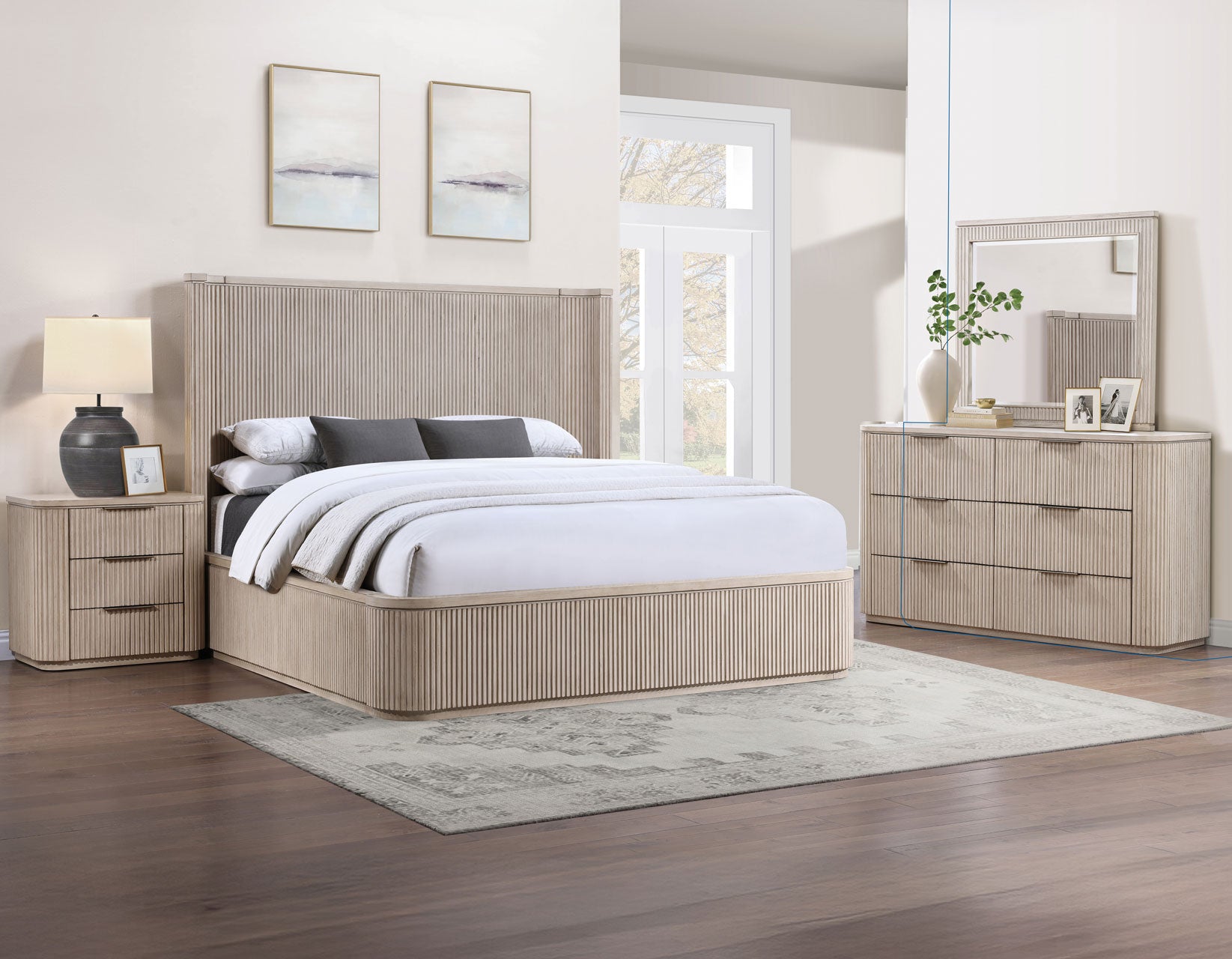 The Henry Queen Bed combines sleek modern design with softened edges, rounded corners, and elegant reeded detailing. Crafted from sturdy oak veneers in a light tan finish, it brightens the space and serves as a stylish yet understated anchor for your room. The headboard’s inverted corners provide a cozy nook, ideal for reading, watching TV, or relaxing in comfort.