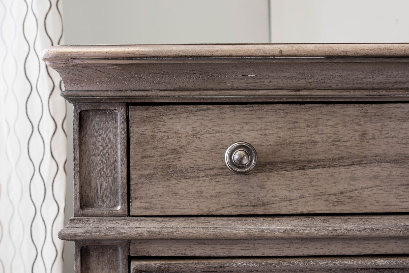 Vintage styling in a classically styled bedroom collection. Highland Park features a waxed driftwood finish complemented beautifully with a tufted fabric headboard. Storage pieces include chest, dresser, and nightstand to complete your bedroom.