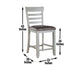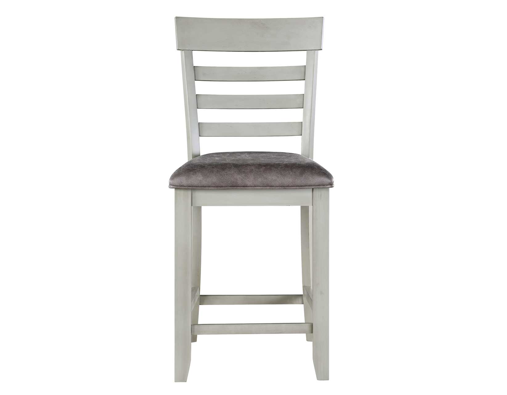 An upholstered Counter Chair that sports a stone gray finish and vegan rawhide seat to make a stylish and comfortable addition to any kitchen or dining area. The horizontal slatback design features a shaped top rail for a relaxed transitional appeal. Stretchers add structural support and a place to rest your feet when seated at the Hyland Counter Table or a Counter Bar.