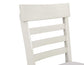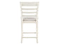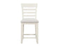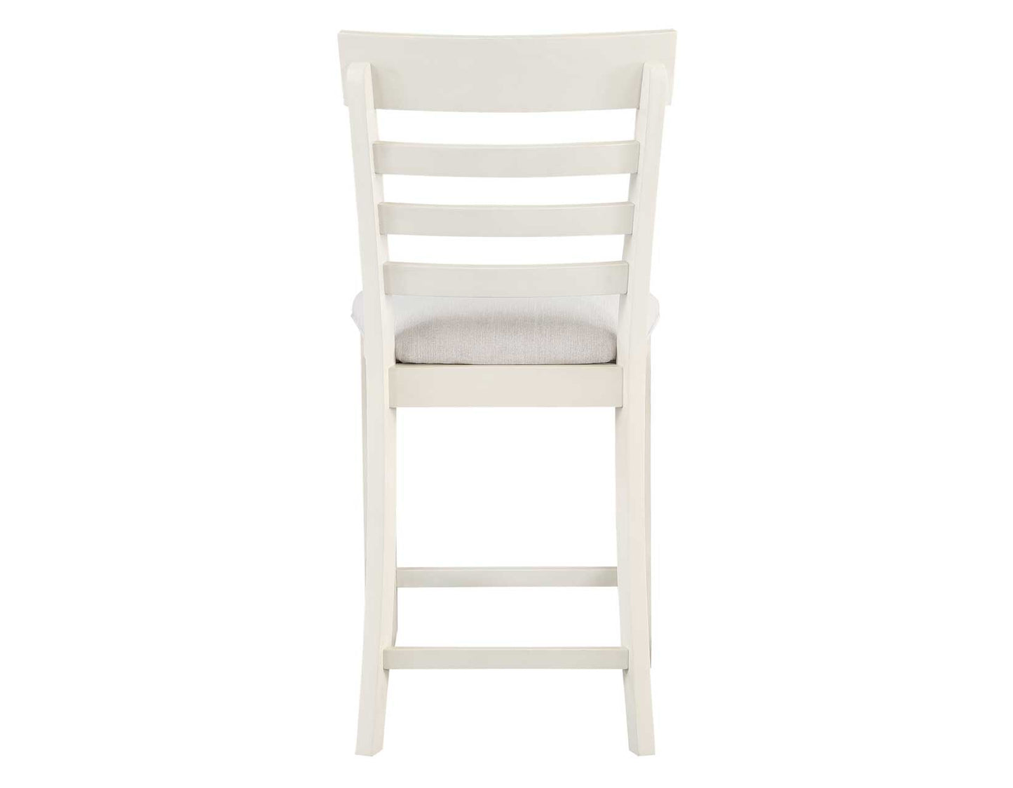 An upholstered Counter Chair that sports a crisp white finish and cream-colored fabric seat for a fresh, comfortable addition to any kitchen or dining area. The horizontal slatback design features a shaped top rail for a relaxed transitional appeal for modern, farmhouse or coastal environments. Stretchers add structural support and a place to rest your feet when seated at the Hyland Counter Table or a Counter Bar.