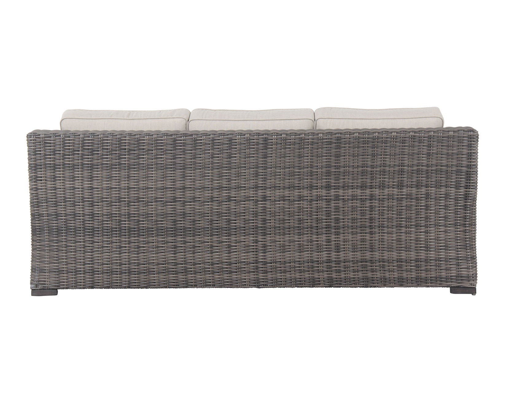 The Jones seating group offers a classic Sofa and Chair combination in a full-round resin wicker package. The matching chair is available in stationary or full-swivel models. The dark gray aluminum Coffee Table proves a suitable companion to the seating with its mission influences and bottom shelf.