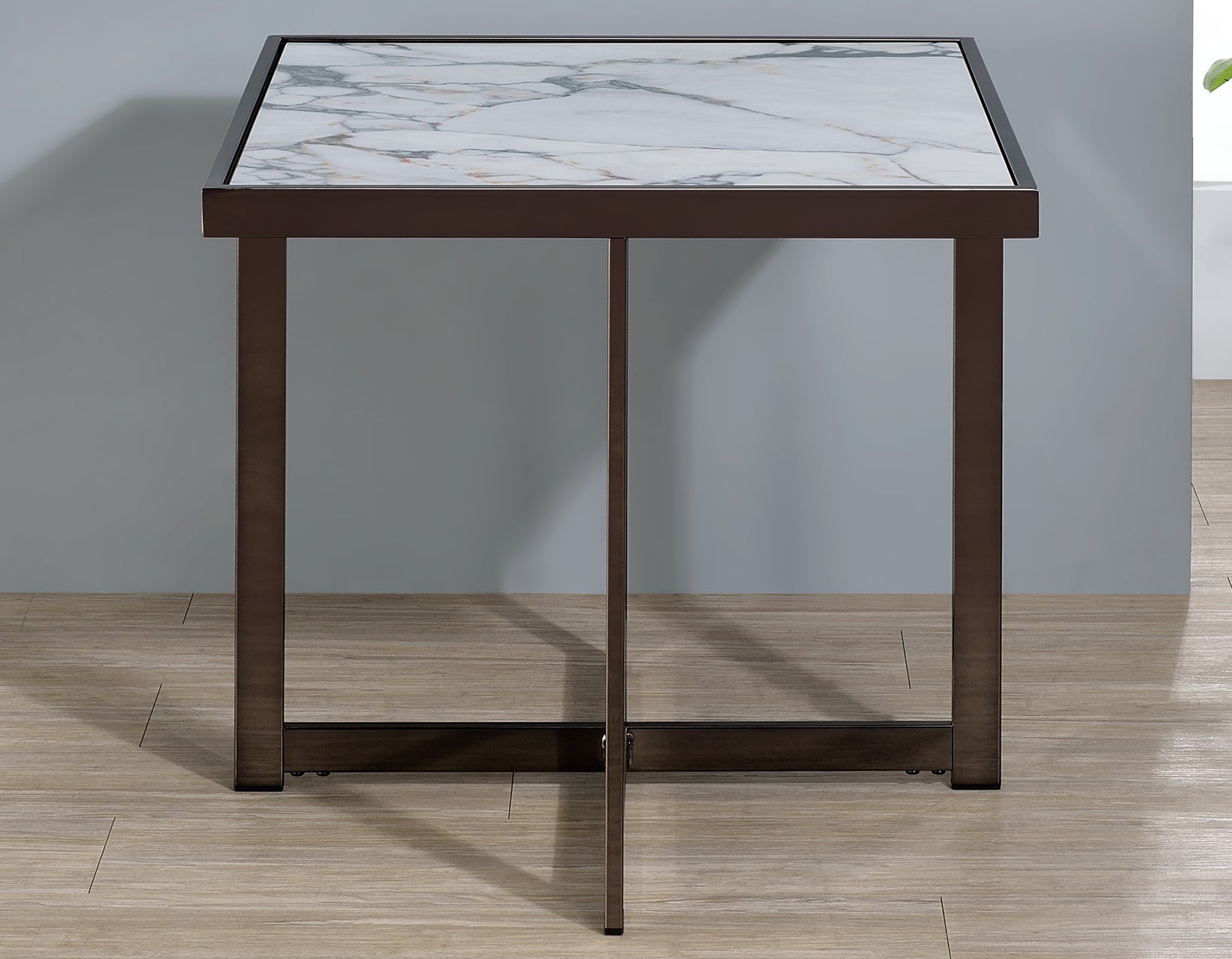 Sleek sophistication takes center stage with the Kayley sintered stone side table. This modern piece features a striking sintered stone inlay atop a black nickel-finished iron base, blending elegance and durability. A sled base with cross stretchers provides stylish support and lasting stability. Best of all, enhanced performance features reduce maintenance worries. With the Kayley table, your space stays effortlessly pristine. Perfect for contemporary settings, it’s a statement of refined taste and smart functionality—where modern design meets everyday convenience.