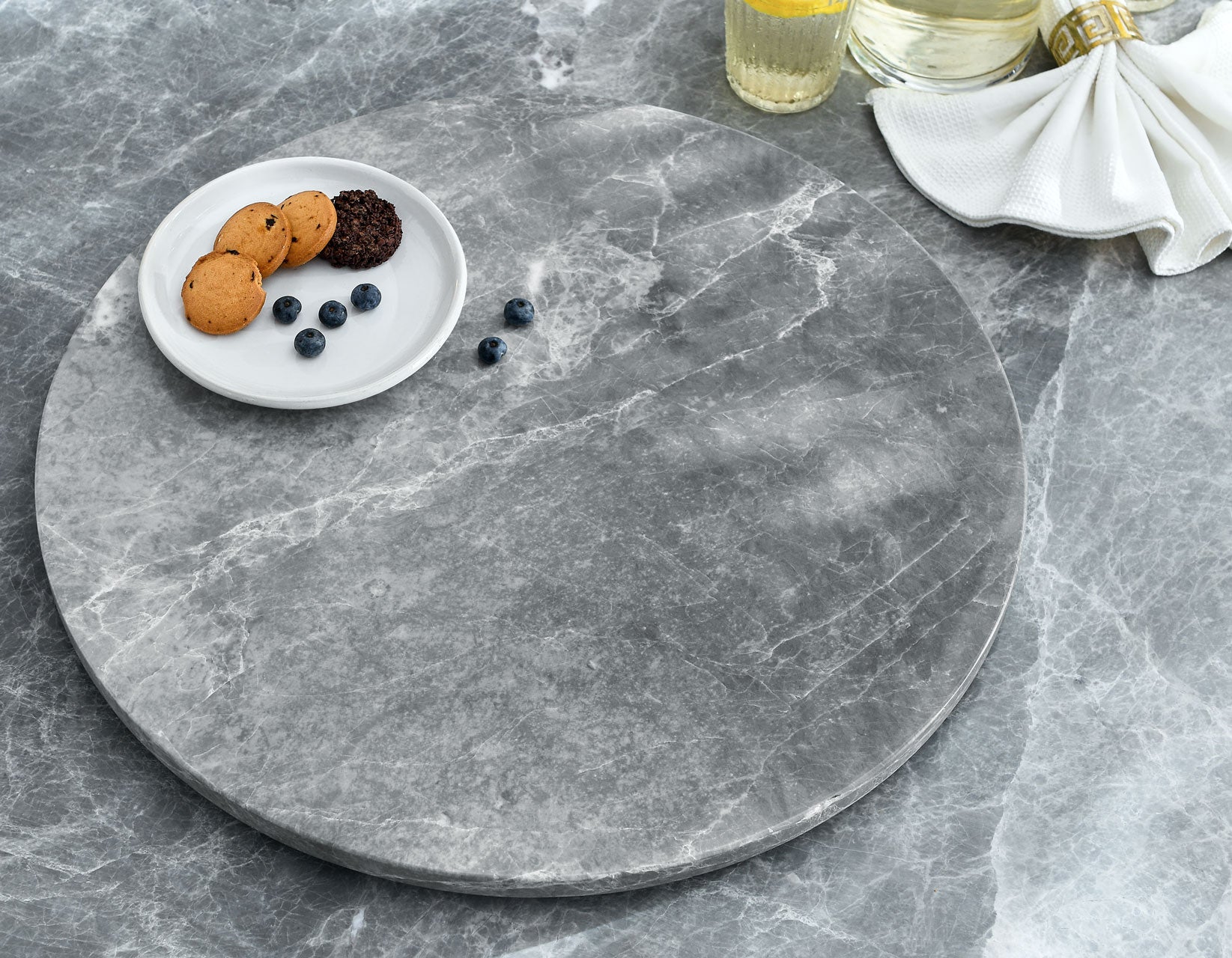 A beautiful and natural accent on any table, the Kaza 18-inch gray marble lazy Susan offers easy and elegant access to dining items for everyone with a smooth and rotating surface. The beauty of marble shines through in this accent that can be used with large round or square marble or wood tables. Fused by nature, each Kaza Lazy Susan is unique so you can rest assured yours is one-of-a-kind.