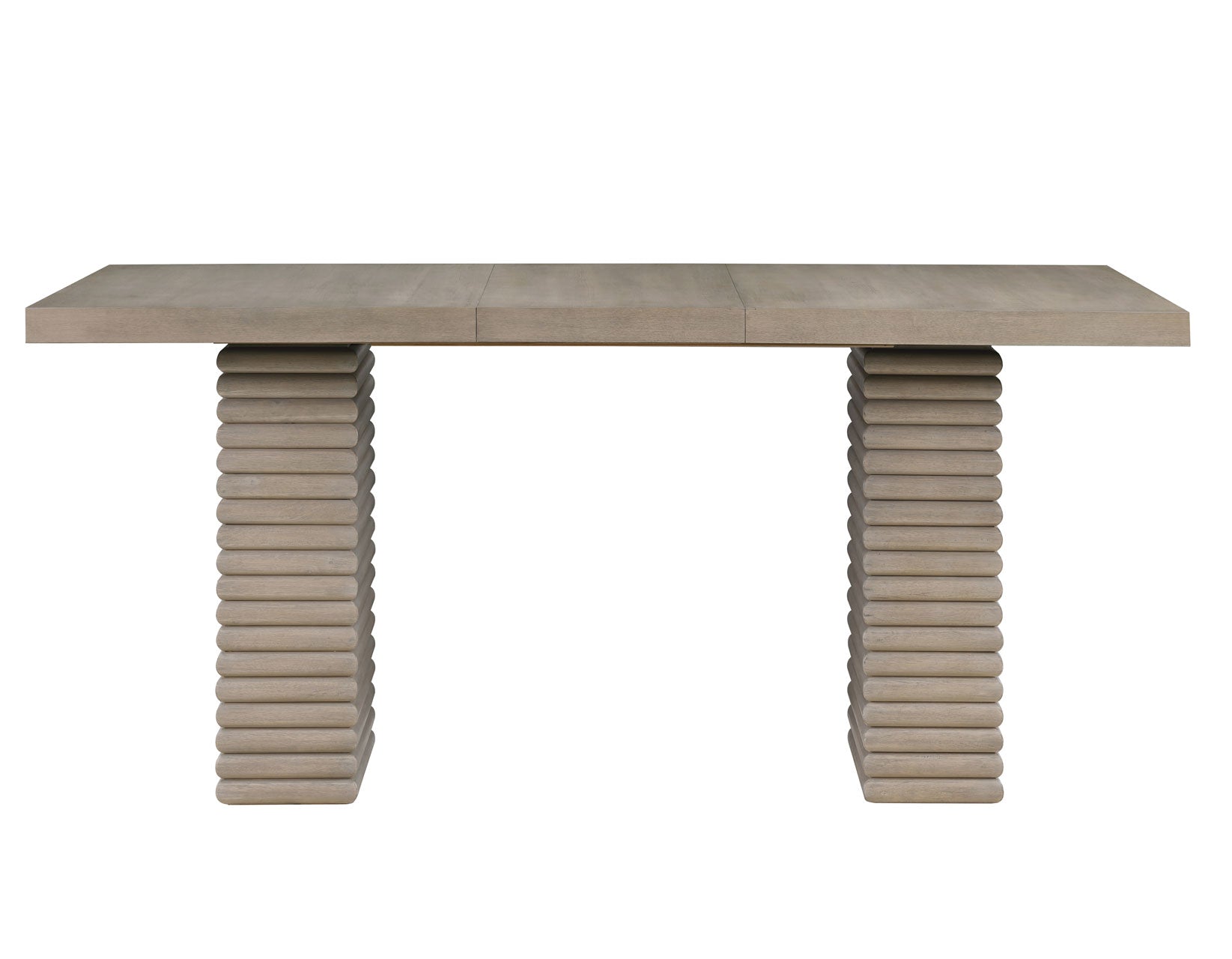 Experience modern elegance with the Lily 6-Piece Counter Dining Set. Crafted from ash veneers, acacia, and mango solids, its greige finish complements contemporary interiors. Clean lines and a minimalist aesthetic exude refinement, while the reeded design adds depth. Expand the table from 60 to 78 inches with the included leaf, accommodating up to eight guests. The double pedestal base ensures stability and ample legroom. Elevate your dining space with the Lily Set—a blend of style, functionality, and comfort, perfect for unforgettable moments with loved ones.