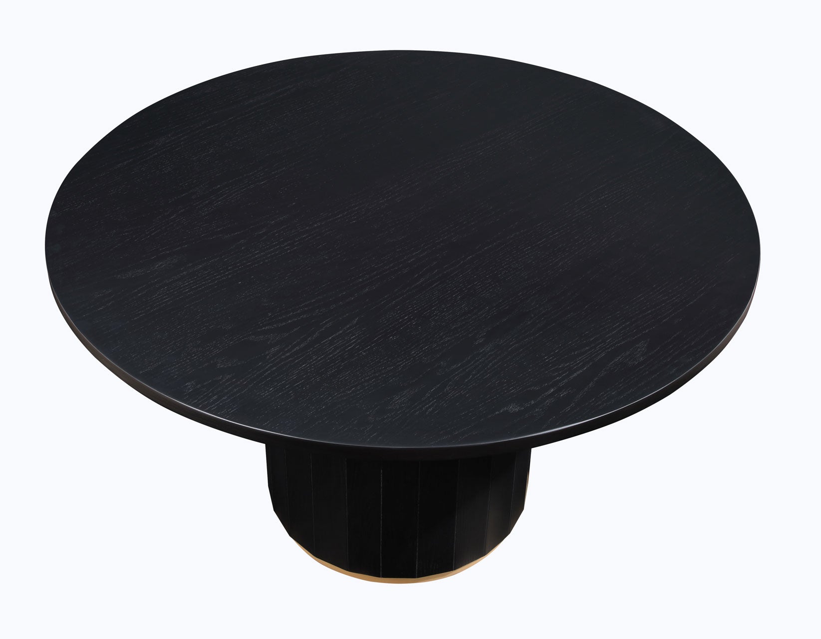The Magnolia 52-inch Round Table in ebony forms a centerpiece that marries elegance with style. The table features a sturdy circular base, providing a strong foundation while offering ample clearance for chairs. Its unique polygonal circle design is highlighted by a striking weathered sand accent on the apron and base that seamlessly elevates the ebony finish to create a cohesive and luxurious look. Designed to comfortably seat up to six people, the Magnolia Table is ideal for fostering a cozy and intimate atmosphere, perfect for close-knit gatherings and engaging conversations.
