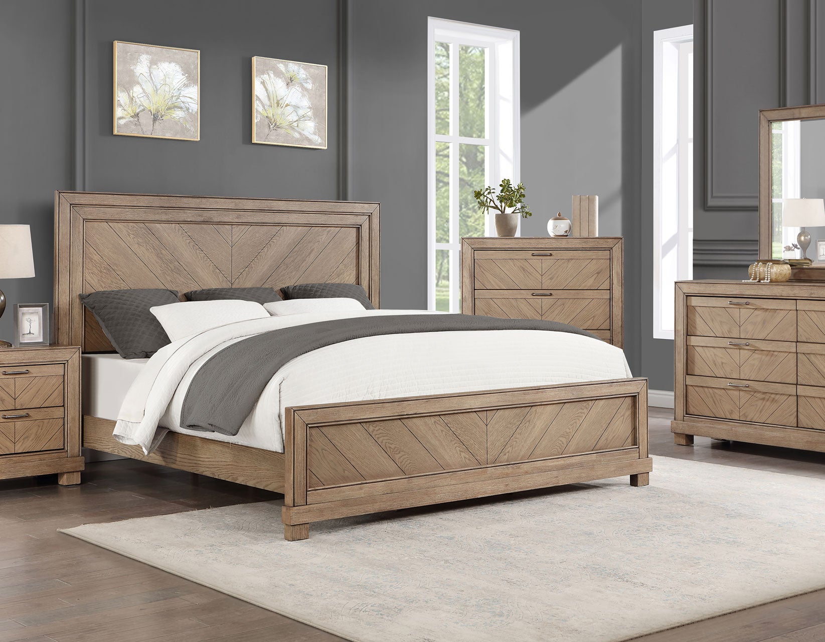 Primitive rustic design meets California Casual style in this rustic, yet refined bedroom set. Montana is finished in a Weathered Sand stain with oil-rubbed brass hardware in a relaxed aesthetic for casual bedroom decors. The Montana Queen Set is anchored with a chevron pattered Bed and Dresser with fully extendible deep drawers and felt-lined top drawers for plenty of space-optimizing storage. This 4-piece collection comes with a King Bed, Nightstand, Dresser and Mirror. Use as is or add the optional Chest for even more storage.