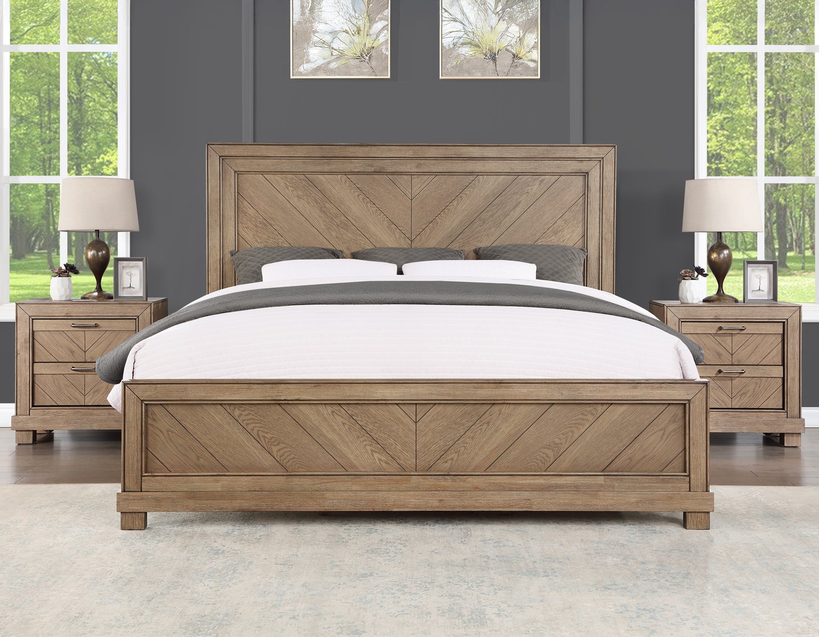 Relaxed and rustic, the Montana King bed brings casual style to today’s bedroom. A warm weathered sand finish complements most interiors with a primitive design that offers simple sophistication with details like a framed Chevron patterned Headboard and Footboard. Whether in the guest room or the Master Bedroom, Montana dresses up a bedroom without making it stuffy.