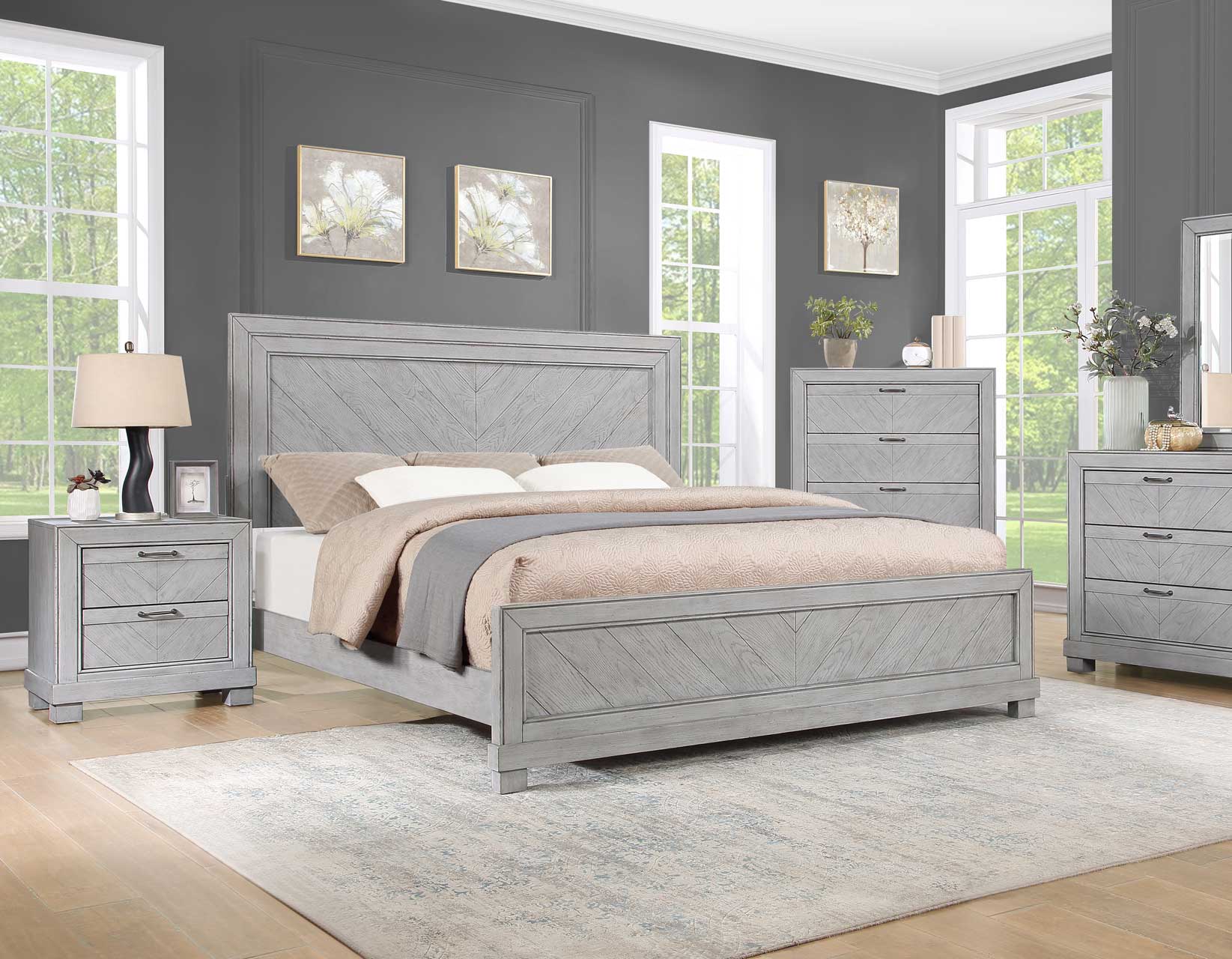 Sharlance King Upholstered Panel Bed with Mirrored Dresser, Chest and Nightstand