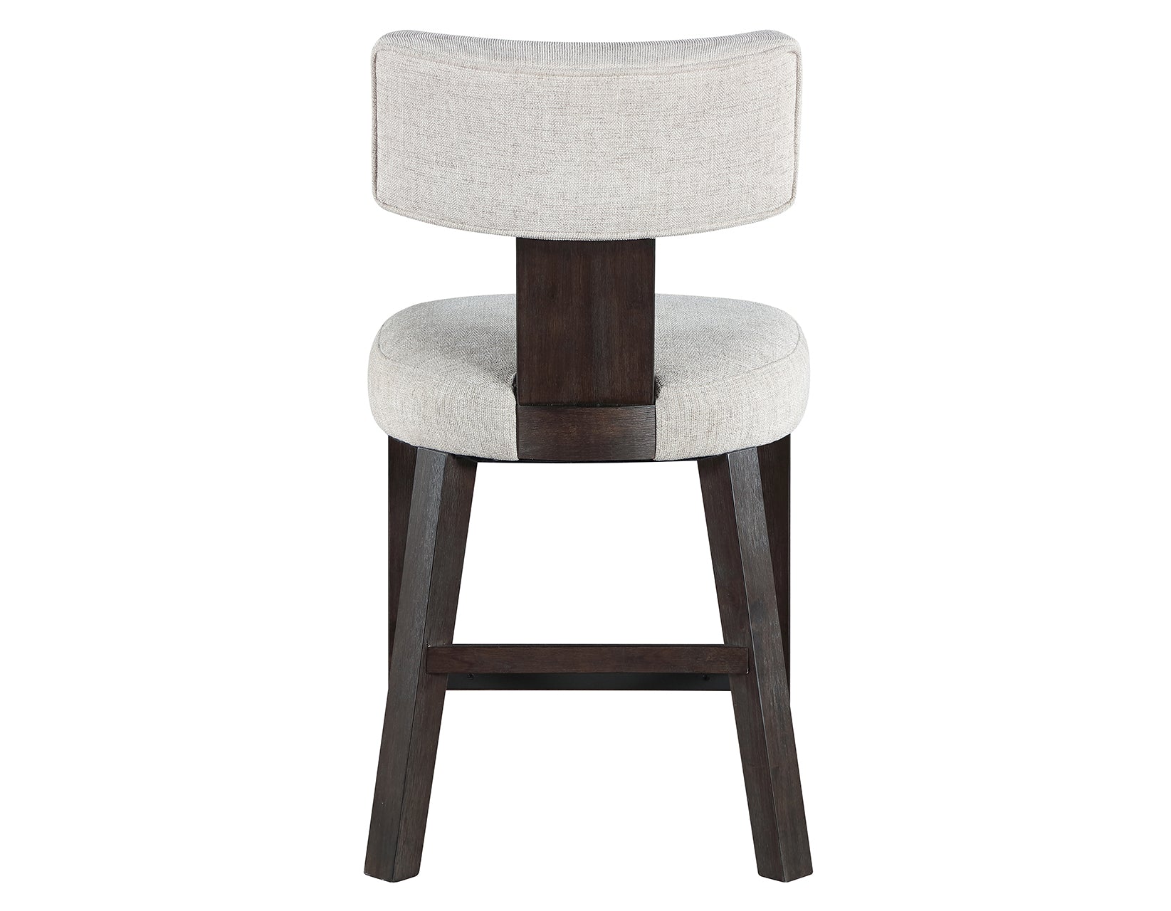 Styled for today’s 36″-high kitchen counters, the Oakley 24″ Counter Stool delivers sleek comfort with a modern edge. A floating barrel-style backrest, supported by exposed wood posts, combines ergonomic support with visual appeal. The 5.5″ thick seat cushion, upholstered in light gray herringbone polyester, offers plush comfort for everyday use. Reinforced front and side stretchers enhance durability and double as a convenient footrest. Finished in a rich charcoal brown, Oakley brings modern style, lasting comfort, and smart functionality to any kitchen or dining space.
