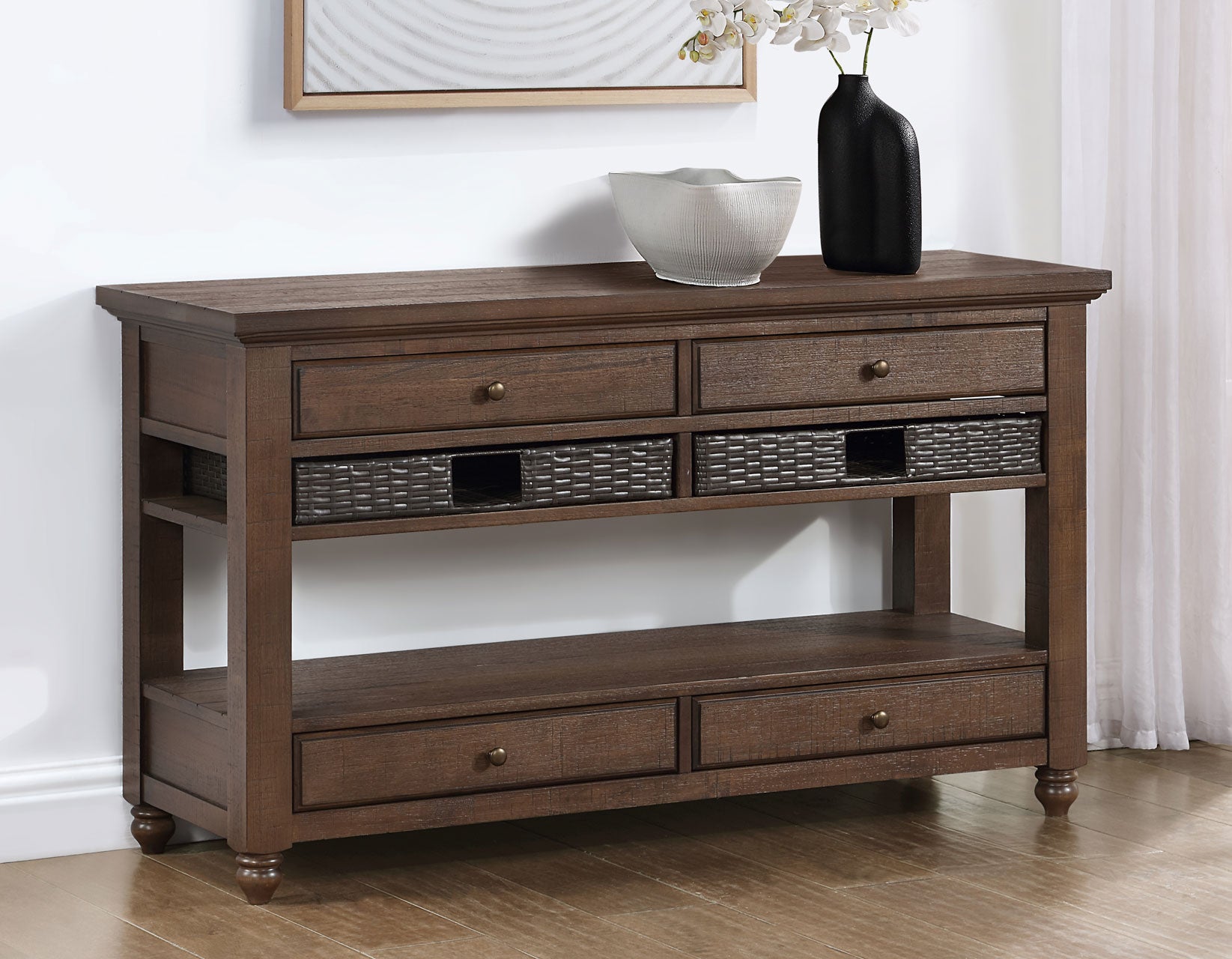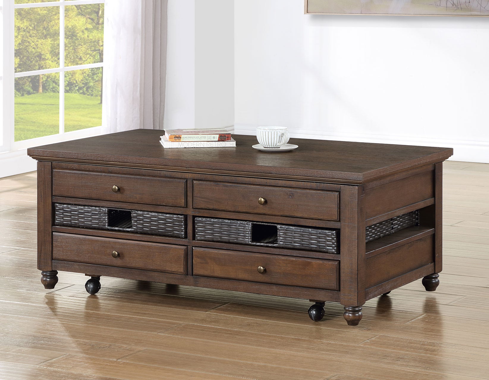 A collection of tables offering bountiful storage in a beautiful design. With classic styling and removable baskets, Oliver exudes farmhouse charm while remaining practical. A lift-top Cocktail Table with casters centers the group with the ultimate in functional design. A burnished chestnut finish adds warmth, while details like the turned bun foot, plank top, and beveled drawer front enhance its appeal..