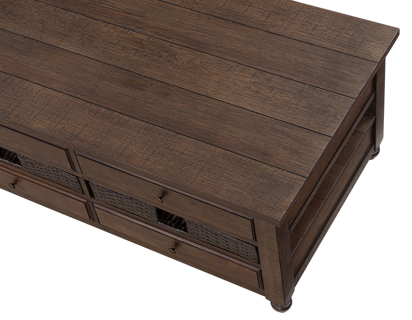 A delightful addition to any living space, the Oliver Lift-Top Cocktail Table boasts functional storage boundless details. With its classic styling and removable basket, this cocktail table seamlessly blends farmhouse charm with practicality. The burnished chestnut finish adds a touch of warmth to its aesthetic, while details like a convenient lift-top for working or dining directly from your couch. Two drawers, two large charming removeable baskets and under-top storage elevate its appeal. Plus, four rotating casters let you move the table around the room with ease. The Oliver Lift-Top Cocktail Table centers a room, offering both style and functionality in one elegant package.