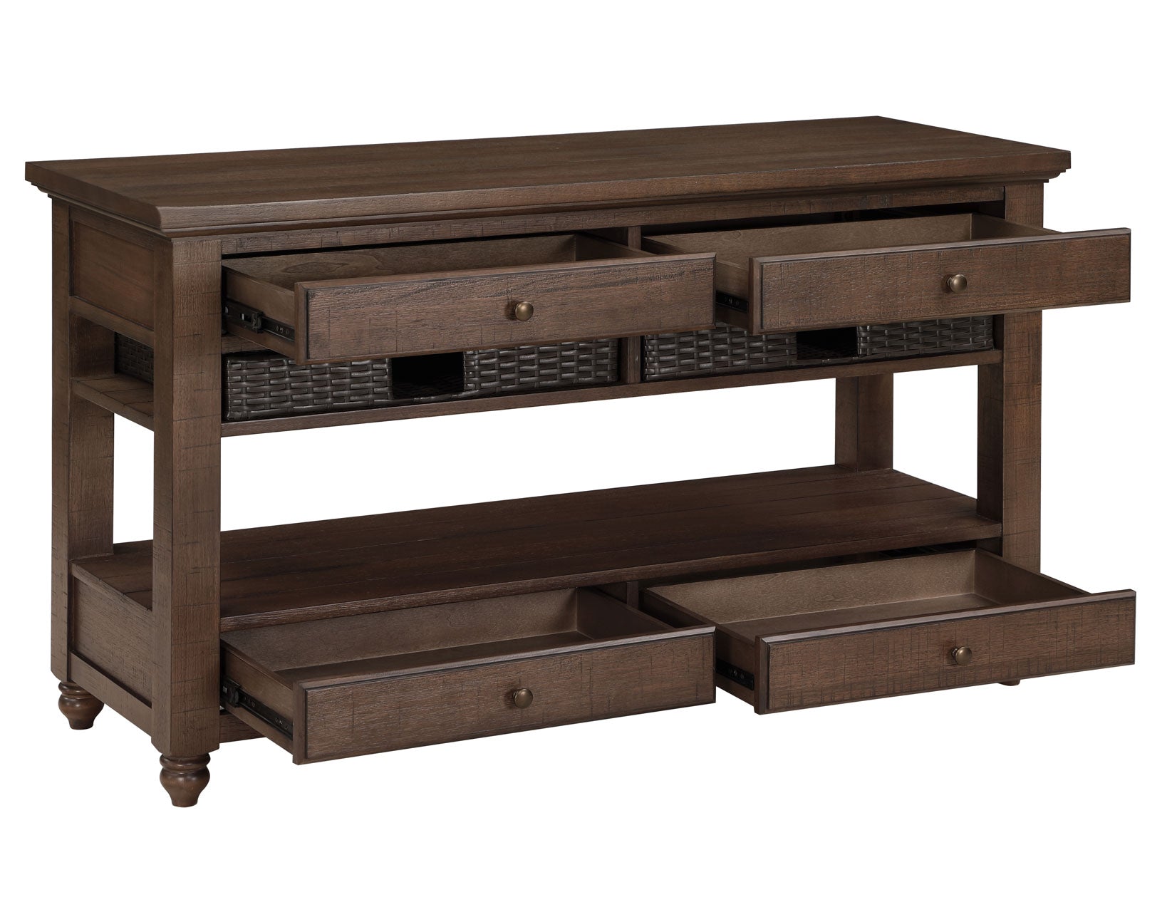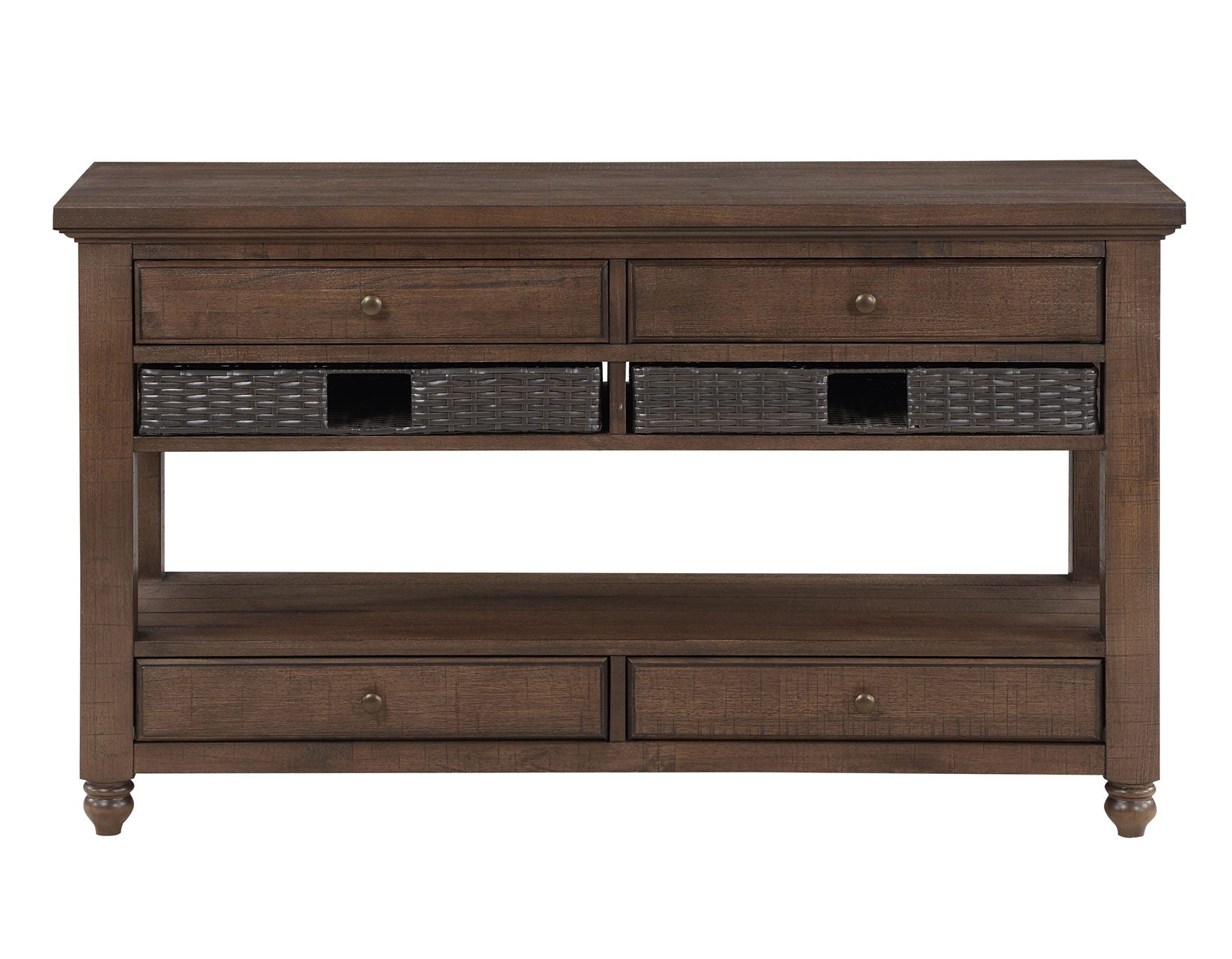 A wonderful addition to a hallway or living space, the Oliver Sofa Table boasts boundless storage possibilities with four drawers and two removeable baskets. This sofa table combines farmhouse charm with classic styling seamlessly, boasting four full drawers and two removable baskets, . The burnished chestnut finish infuses warmth into its aesthetic, while details like the turned bun foot, plank top, and waterfall edge enhance its visual appeal. The Oliver Sofa Table proves to be a dependable and functional accent, blending style and practicality effortlessly.
