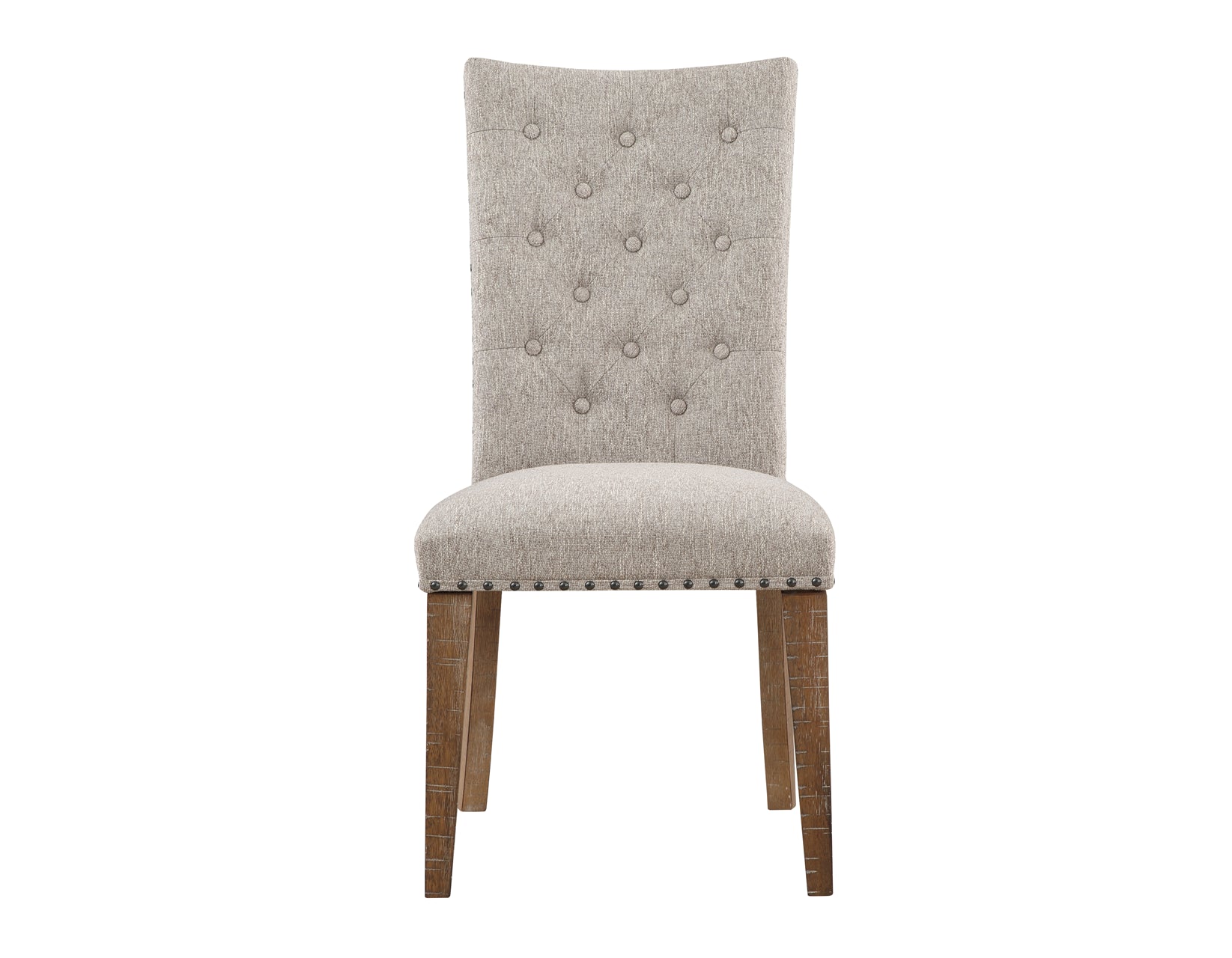 Add a touch of casual elegance to any room with the Riverdale Upholstered Side Chair. Nailhead trim and a button tufted back softens the deeply distressed solid wood legs in a presentation that is both relaxed and sophisticated. A wood trimmed back and full nailhead trim treatment makes sure this chair looks as good from the back as it does from the front. Perfect for dining, accent or office chair, Riverdale shows how to dress up casual comfortably.