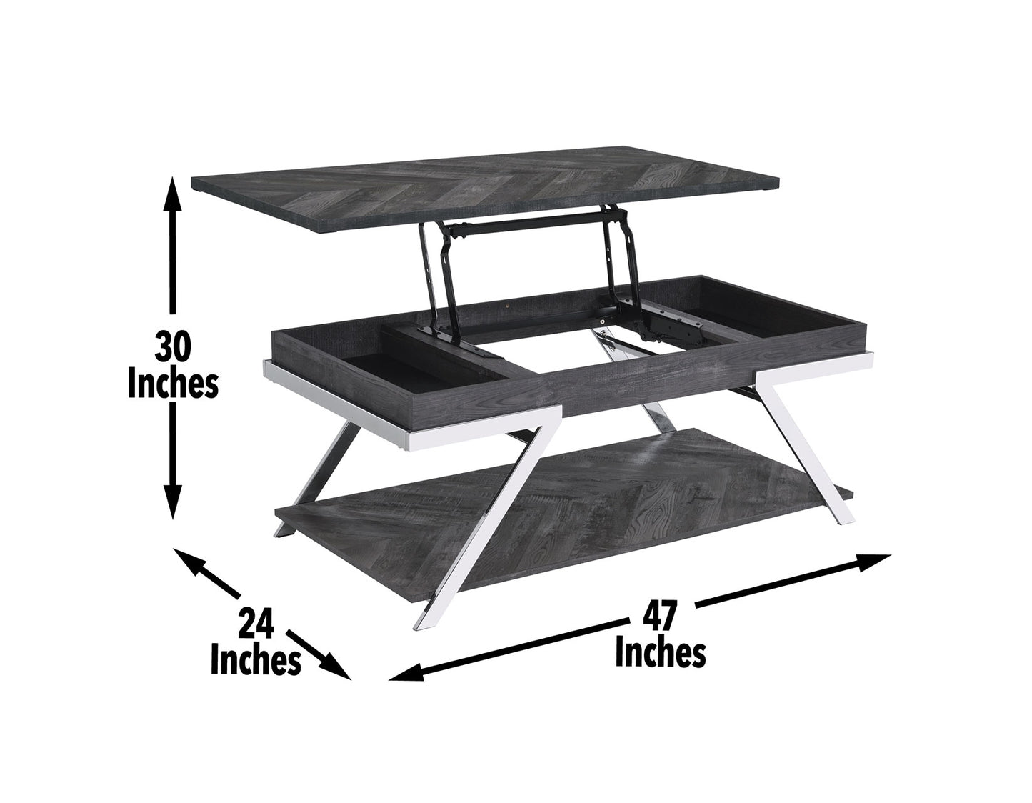 Contemporary style in a shadow grey finish, Roma offers aesthetic and practicality in one package. This mixed media marvel of chrome engineered woods and Silvershield® tops packages together beauty and the immense function of a Lift-Top Cocktail. Work or dine from your living room couch with a simple lift of the top. With undertop storage for devices or remotes, the Roma Lift-Top Cocktail promises to make your life not only easier but more stylish as well.