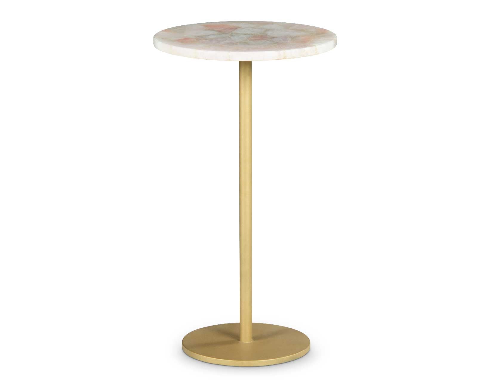The calming and reassuring properties of Rose Quartz are the highlights of the Rosie Chairside End Accent Table. Known as the stone of universal love, Rose Quartz is a beautiful and durable stone that acts as the surface of this charmingly romantic side table. The round shape and mixed media powder-coated gold iron base are sure to stand out in any setting and the piece serves as the perfect End Table to an upholstered set or as a Side Table for a favorite reading chair. The transitional style allows it to fit anywhere your heart takes it.