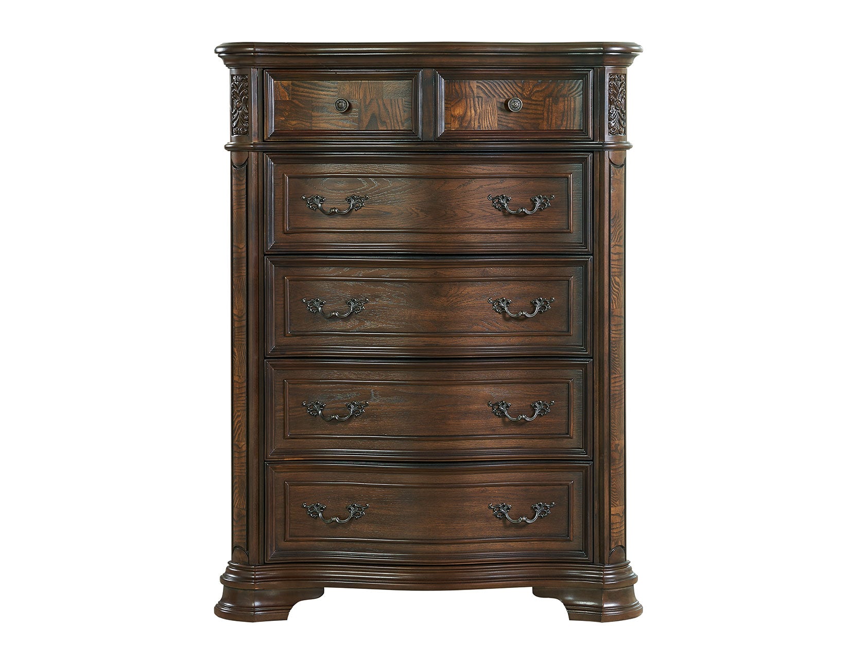 Elegant, traditional styling in a grandly scaled bedroom collection, Royale offers all the essentials of modern life in a package that honors designs from antiques past. Olive ash burl accents combine with a deep, brown cherry finish in a truly opulent presentation.Storage items include a Lift-Top Chest with valuable hidden storage, Dresser & Mirror and Nightstand with USB charging ports.