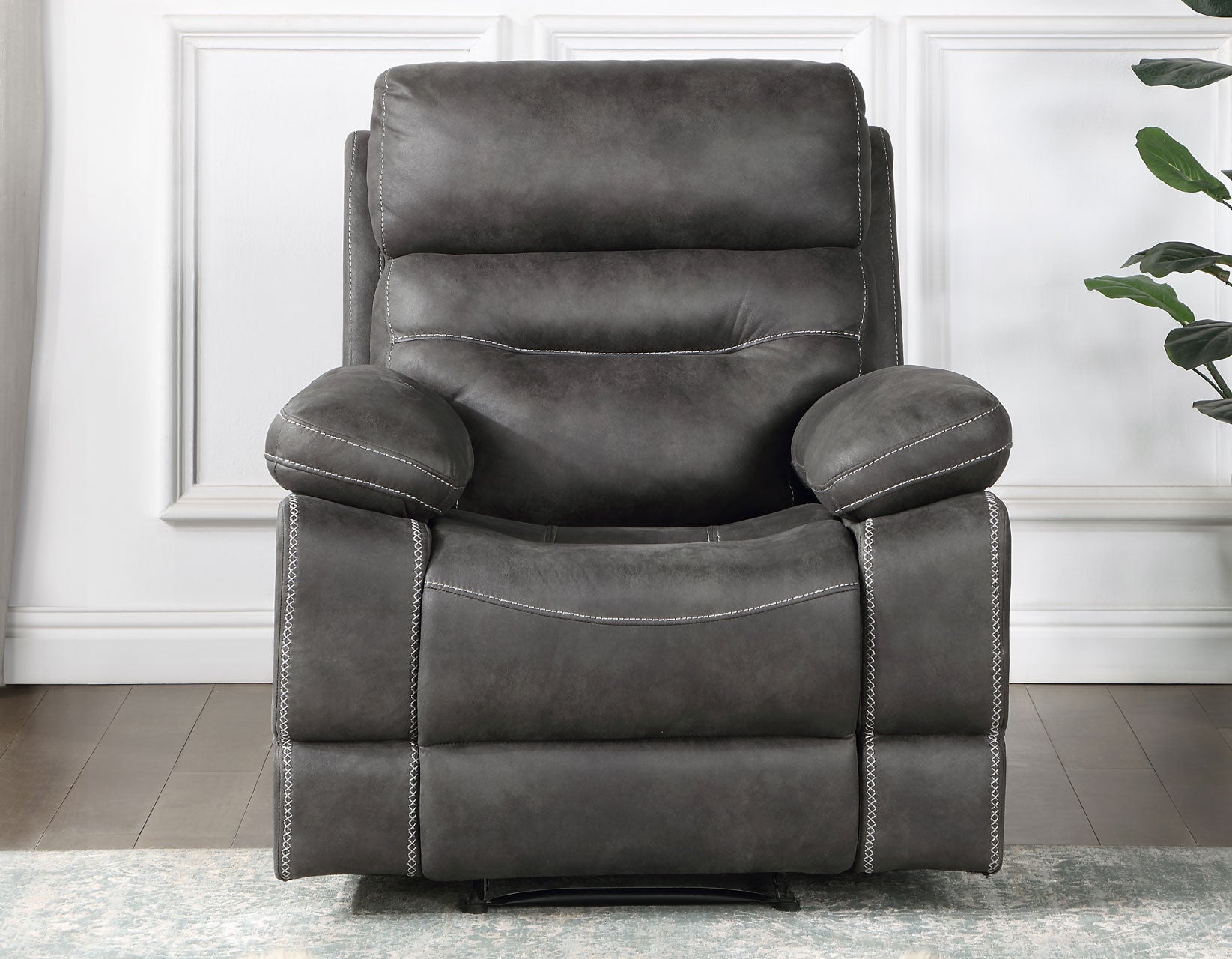 Experience the ultimate in comfort and style – the Rudger 3-Piece Manual Reclining Set. This set includes a reclining sofa, loveseat, and chair, all wrapped in a luxurious bomber jacket-like microsuede cover with contrasting baseball stitch and clean lines that exude a rugged yet refined charm. Each piece features deeply padded seats and bustle backs with fiber-wrapped foam and pocket coil construction, offering extra padding for exactly where you need it. With its neutral gray cover, this set complements virtually any interior décor. Effortlessly recline on each piece with the pull of a lever and slip into relaxation mode to enjoy your favorite book or movie in divine comfort. The unique combination of style and comfort make this Rudger 3-Piece Manual Reclining Set the perfect addition to any room seeking both..