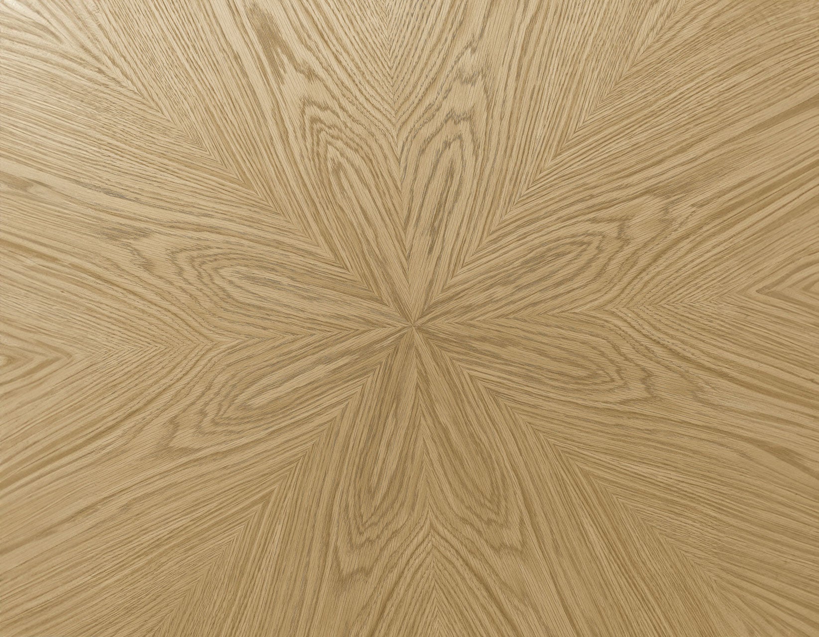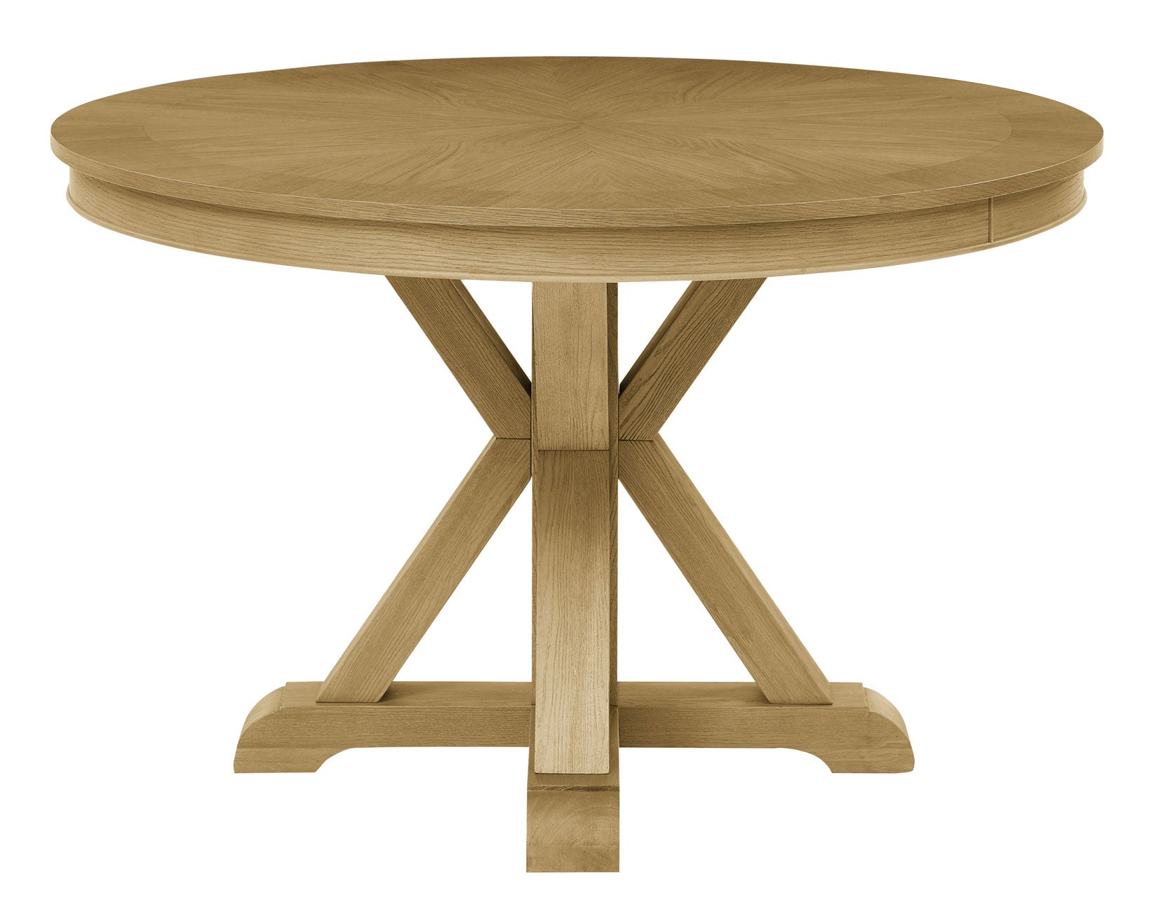 The Rylie 48-inch Round Trestle Table brings rustic design into the future in a cozy and intimate package that will dress up any room. With a natural finish over oak veneers, this table freshens up a classic design. A masterpiece of craftsmanship and style, this table showcases a stunning pinwheel oak veneer designed top that beautifully displays the wood’s character and grain. The rustic, timber beam trestle base provides a solid foundation, ensuring stability and durability.