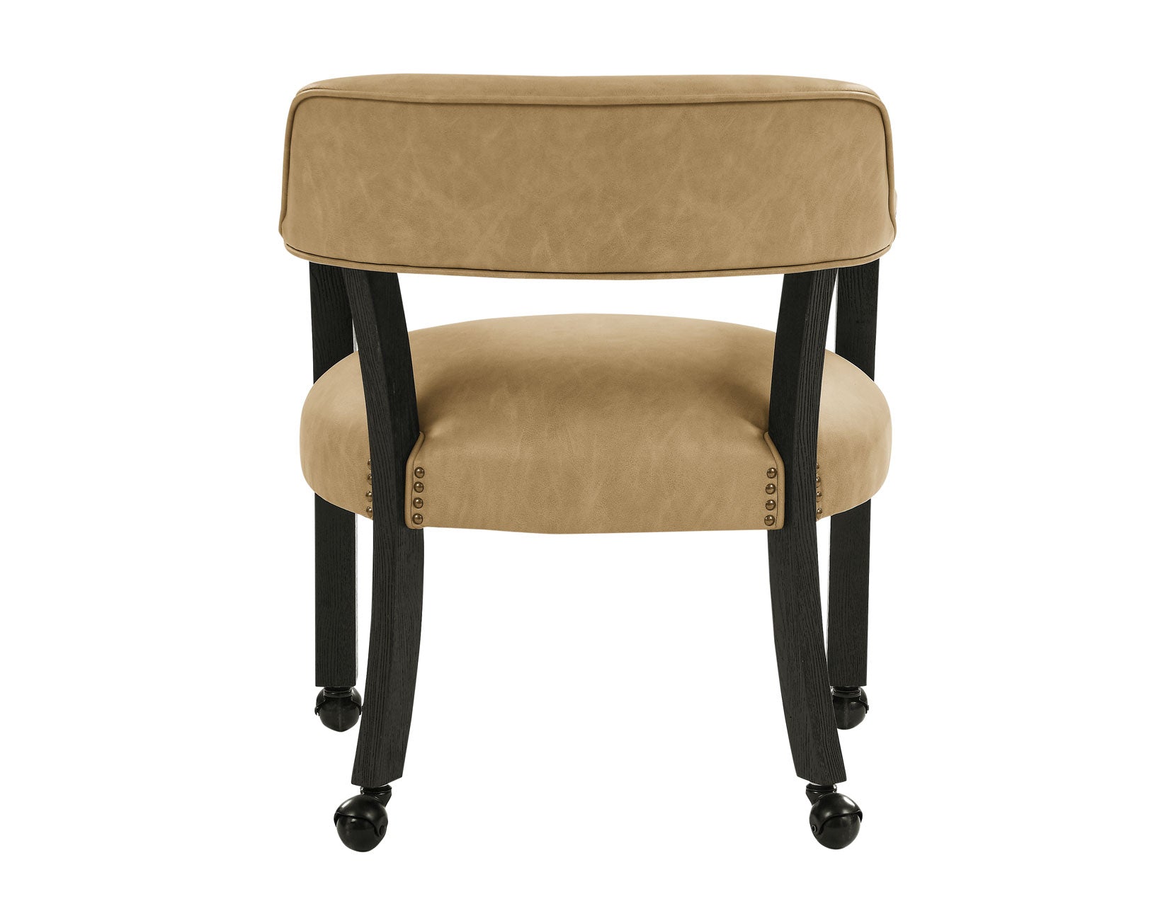 Get ready for game night with the Rylie Black Finish 6-Piece Game Dining Set! This set includes a 48-inch round table with a folding game top and four comfy castered Captain’s chairs in sand vegan leather, jazzed up with copper nailhead trim. The folding game top offers eight stations with dual cupholders and chip holders. When the games are done, remove the top, tuck it away in its carry case, and you’ve got a sleek dining table ready for four.