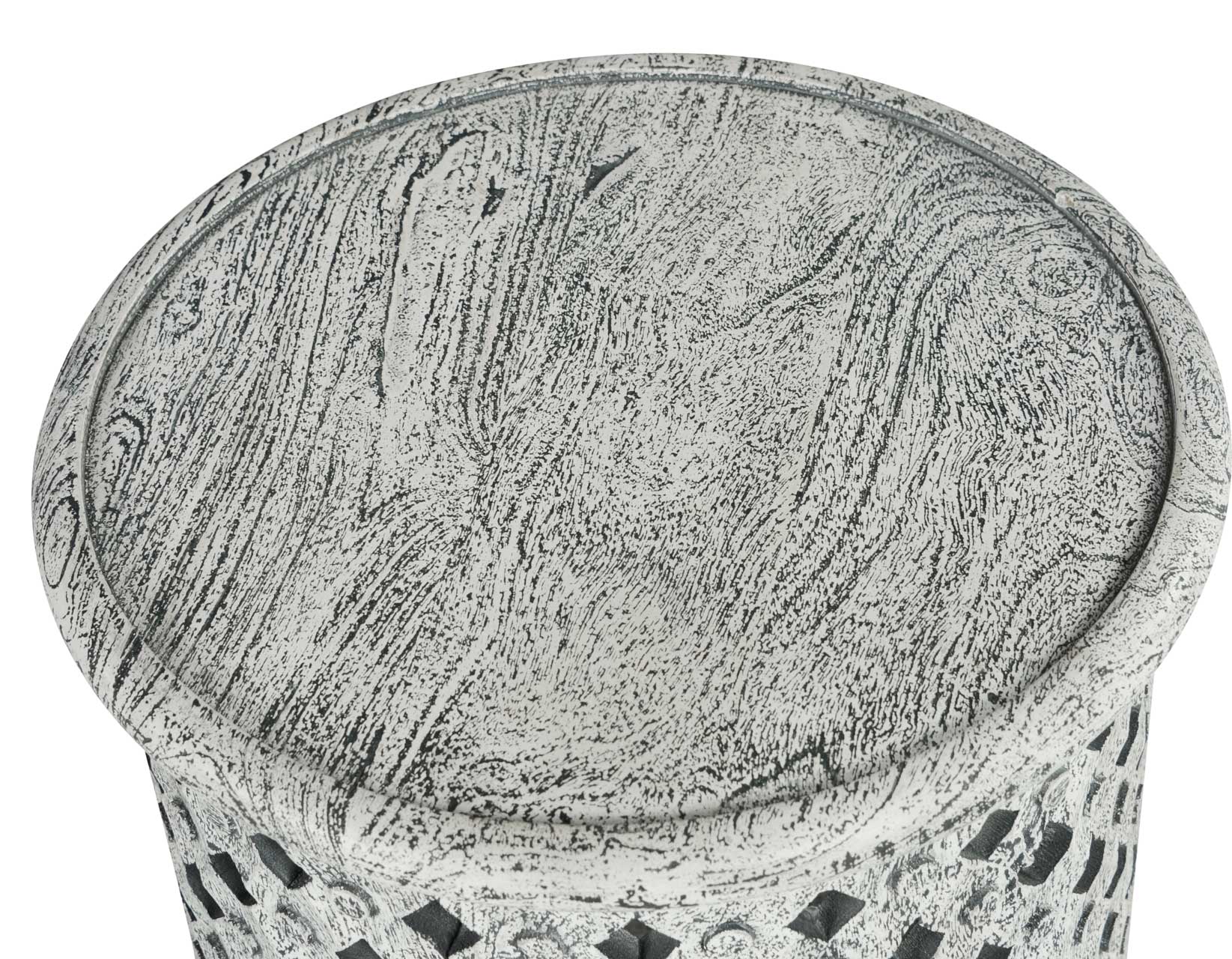 Hand-crafted wood-carved End Table in an aged alabaster finish, Samir features a transitional design that works whether your tastes are farmhouse or traditional. The round table dimensions fit well with Sectional Upholstery or Sofa Sets and feature a latticework base that adds interest to any room.