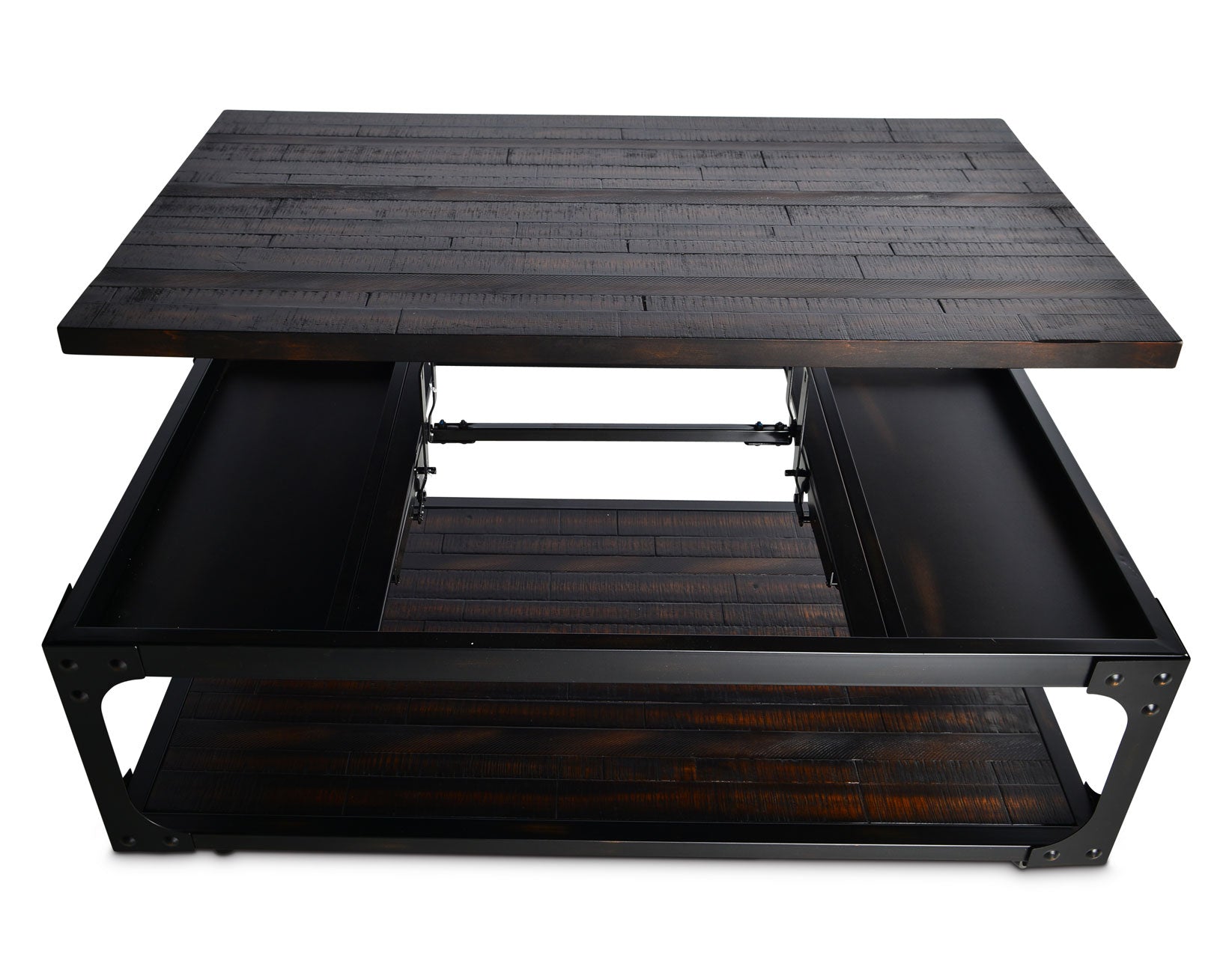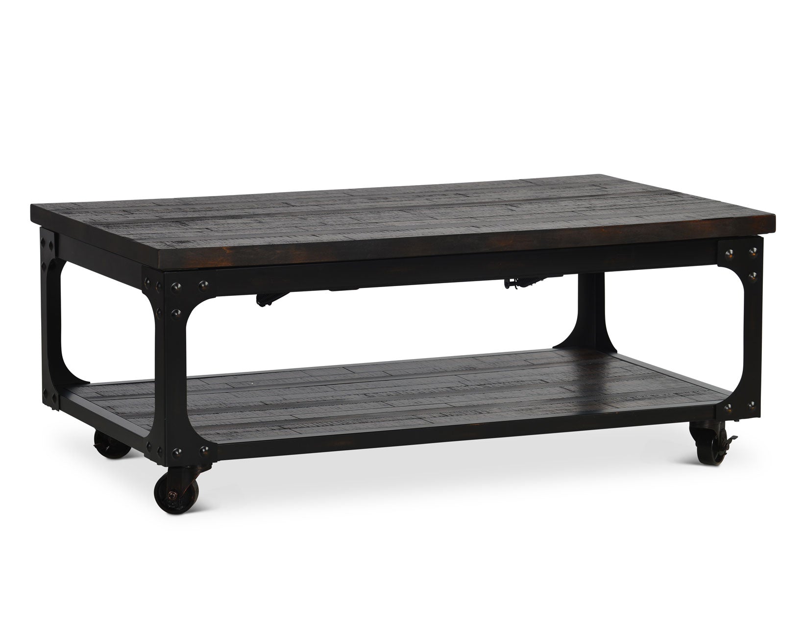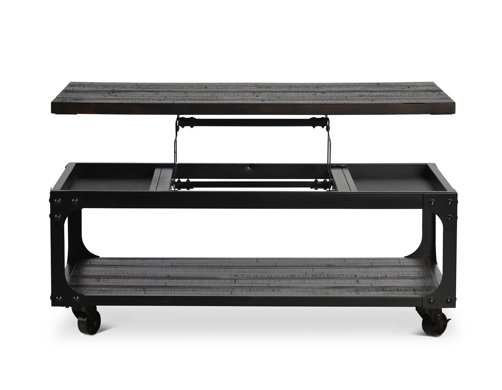 Sherlock presents rustic industrial styling in a lift-top cocktail set that will bring function to your living room tables. The highly distressed top and base of the tables give interesting character to the table while the metal structure adds an interesting mixed media component to the group. Four large locking casters give the Cocktail added mobility which pairs well with the matching End Table.
