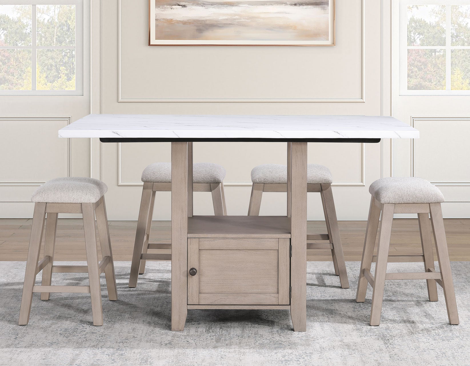 The 5-Piece Taylor Faux-Marble Counter Dining Set offers a stylish blend of comfort and practicality. The 36-inch faux-marble table delivers the elegant look of real marble at a more affordable price, with a tan wood finish that brightens any space. Hidden storage and an open shelf add functionality. Four 24-inch counter-height chairs feature gray upholstered cushions for comfort, solid wood legs for durability, and built-in footrests for support. With clean lines and transitional styling, Taylor complements both classic and contemporary spaces with ease.