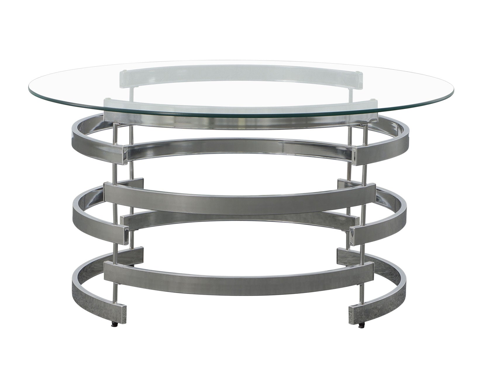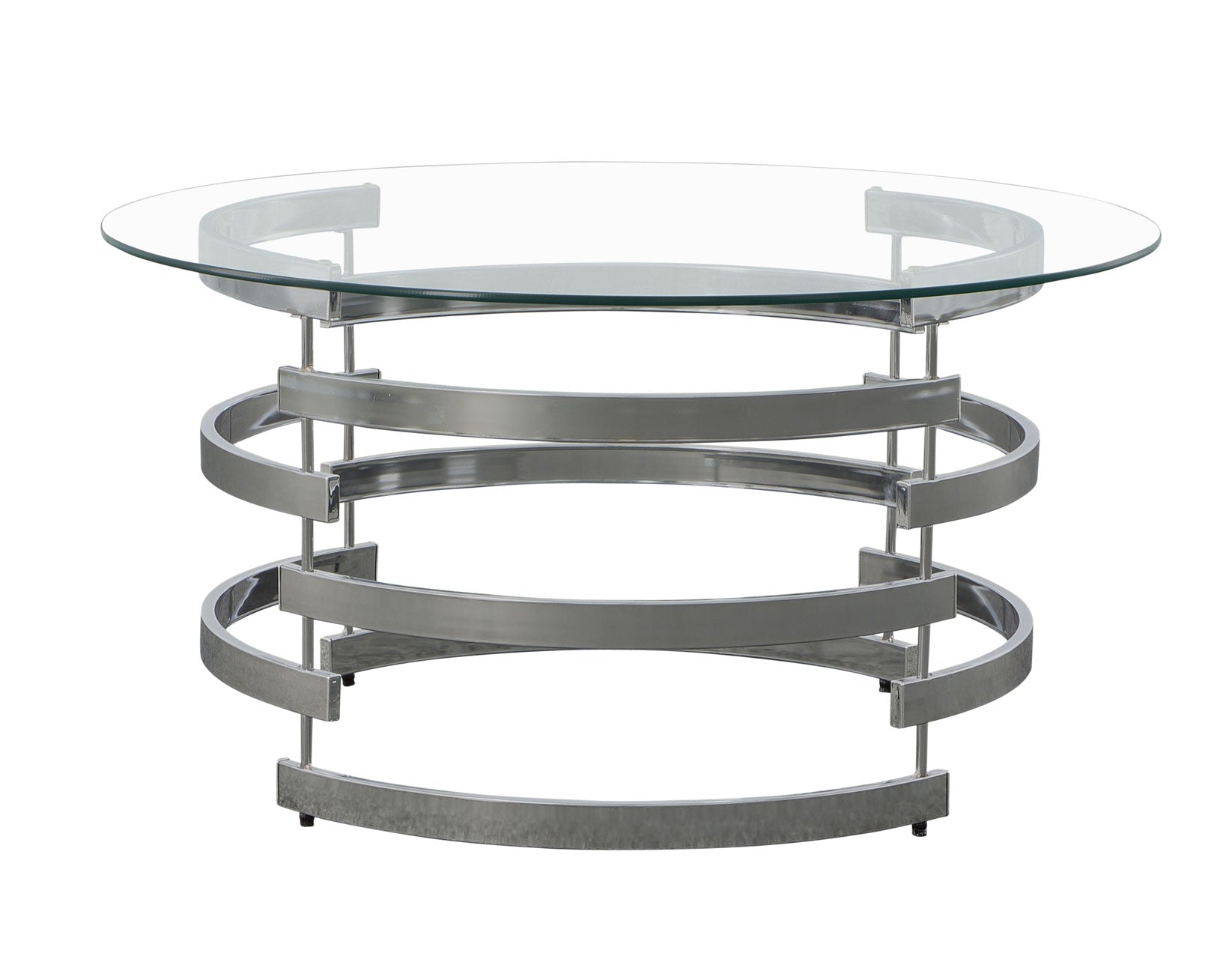 Give your room an artistic flair with the Tayside ! The contemporary collection in chrome is plated metal with glass tops. Shaped bands of metal stack to form a circular base. Lay-on 12mm tempered glass top has a polished edge for a clean silhouette.