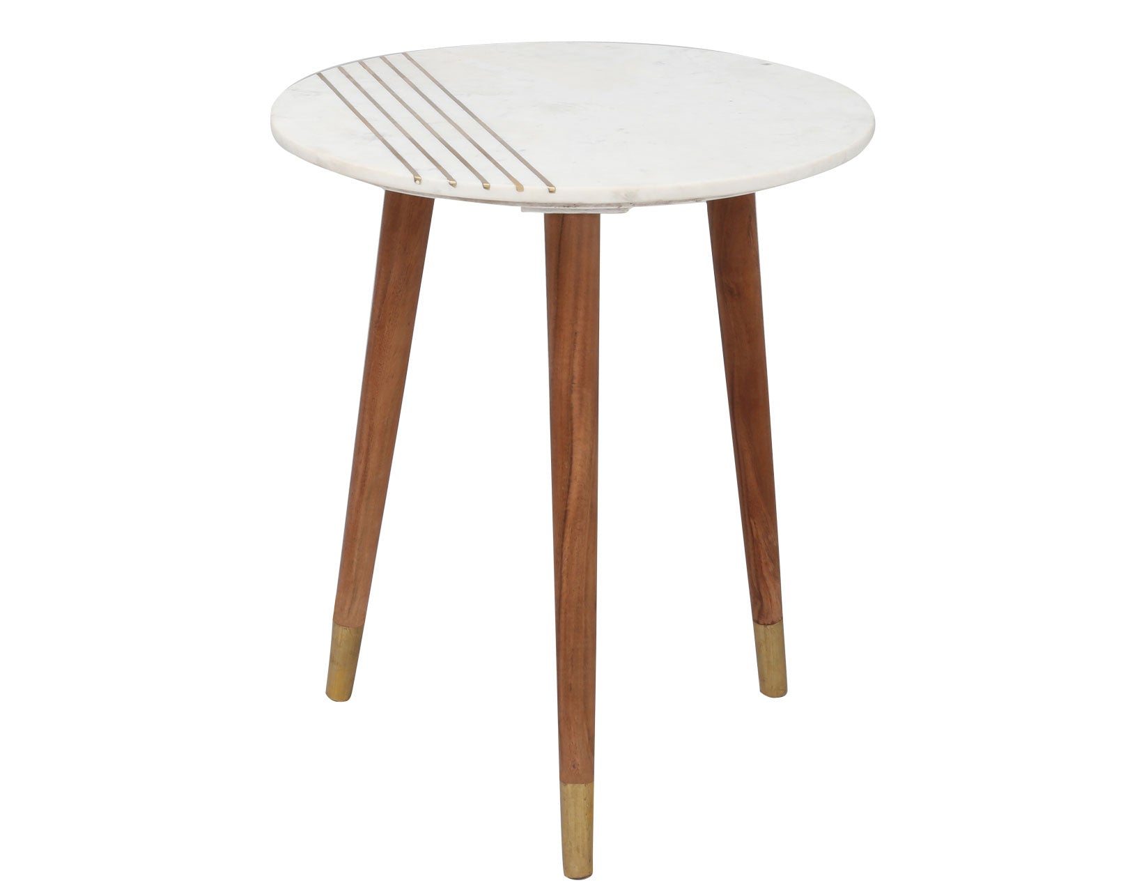 Mid-Century Modern styling combines with white marble tops to create a beautiful set of Nesting Tables from Terrace. The 2-pack table set features solid wood tubular legs in a natural acacia finish with brass metal accents on the feet that match the art-deco brass inlays on the white marble top. The complementary brass inlays warm up the cool contemporary style for a set of tables you will love.