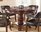 Enjoy both game night and dining night with this dual=purpose dining and game table. The 48-inch round table comes in a medium cherry finish and can accommodate four comfortably for dining with a game top that converts into a game table worthy of Las Vegas1 The upholstered.captain’s chair is castered for easy mobility and comes in a wide range of colors perfect for every decor.