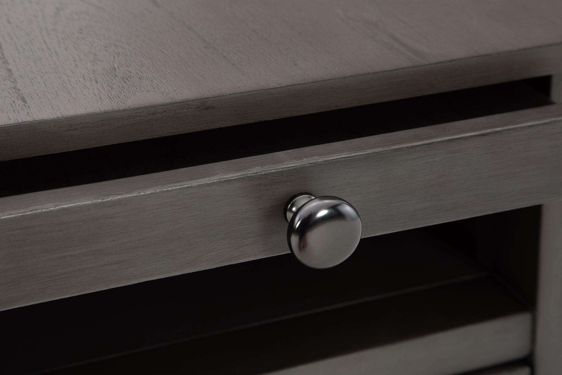 Add big character to a small space with this chairside end table. With its compact size and strong silhouette, it can go anywhere and blend easily into the decor. Less is so much more with the Shaker-inspired design and gray wood tone finish. Loaded with form and function, this end table displays accent pieces and stores essentials securely while keeping devices powered up.
