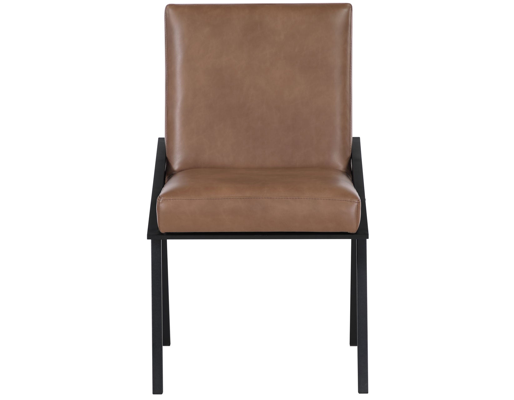 A modern mixed-media marvel, the Tucson Side Chair delivers all-day comfort with versatile appeal for dining rooms, home offices, or living spaces. Upholstered in camel-colored vegan leather, the seat is generously cushioned with 1.1-density foam for exceptional comfort. The sleek black powder-coated iron base adds durability and a contemporary edge, creating a stylish contrast that elevates any setting.