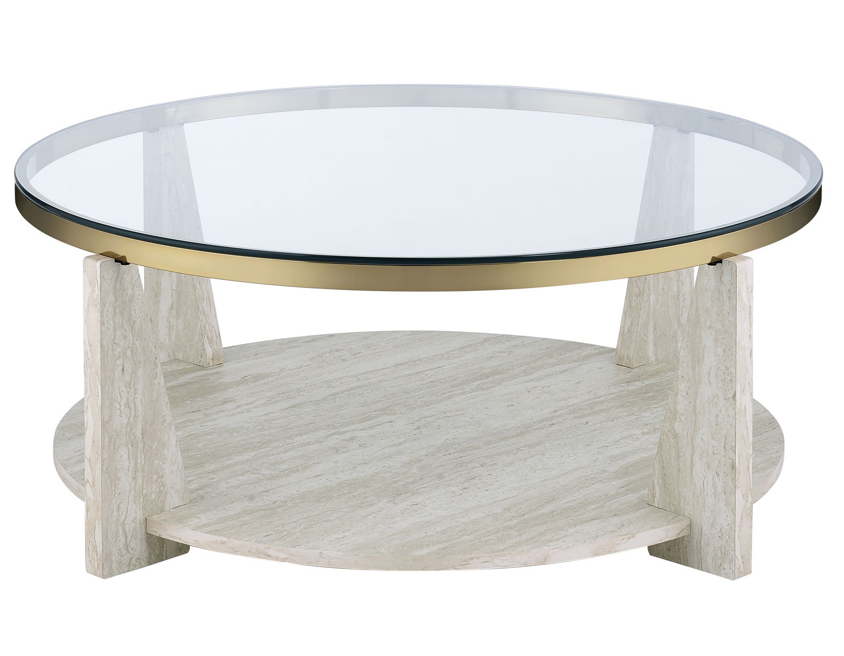 With its modern profile and sleek 42″ round shape, the Wanda Castered Glass Top Coffee Table serves as a stunning centerpiece for any room. The tempered glass top provides a chic display space, beautifully showcasing items on the lower shelf. A satin brass band adds a touch of luxury, perfectly complementing the faux stone base that delivers the sophisticated look of stone at an affordable price. Architectural supports create a striking contrast with the round base, while convenient casters ensure effortless mobility for cleaning or repositioning.