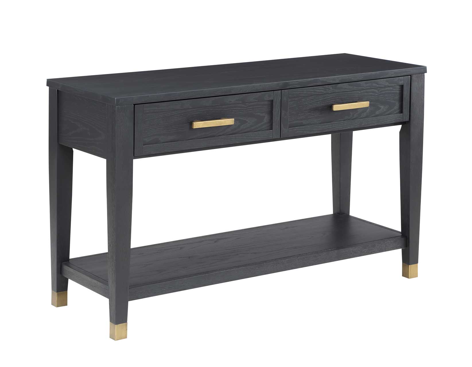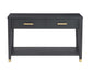 A sleek modern Console for a hallway or behind a Sofa, the Yves Sofa Table adds beauty and dimension to any room. Tapered legs and brushed brass accents make for a contemporary design with the added plus of two fully functioning drawers that add handy remote storage to any room.