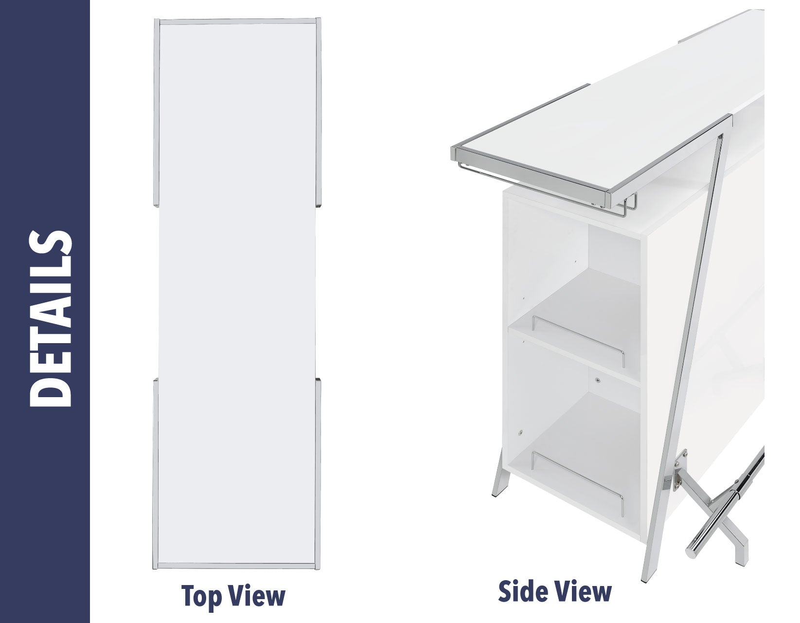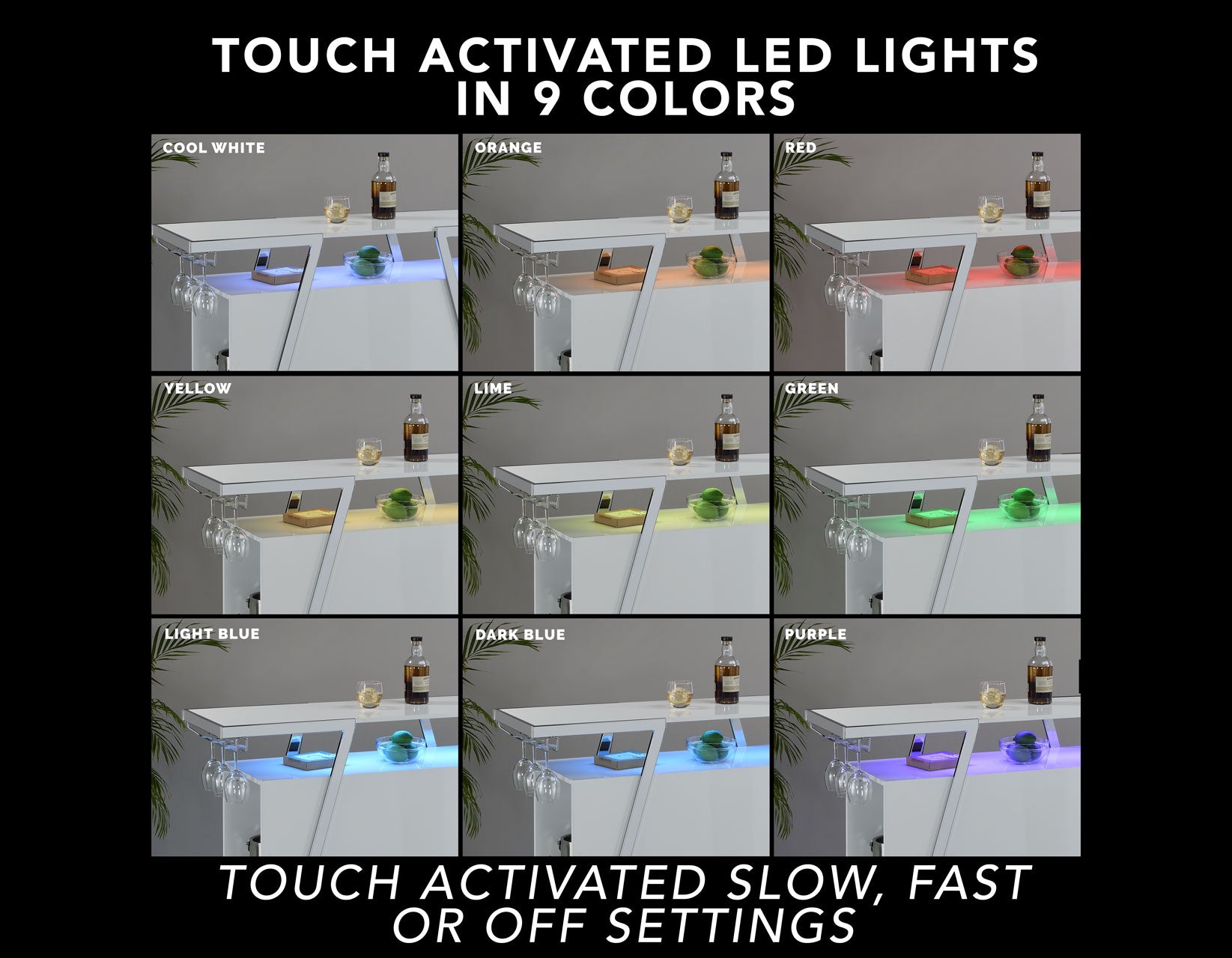 The Zena Bar with LED Lights is perfect for starting your party with style. Featuring a white and chrome design, it boasts a modern geometric shape. It efficiently holds all your bar necessities, including adjustable shelves, a bottle rack, and hanging stemware holders. The highlight of the Zena Bar is its touch-activated LED lights underneath the top, offering nine color options and various lighting speeds. This feature allows you to either set a relaxing ambiance or liven up the atmosphere, making the Zena Bar a central piece in any celebration.